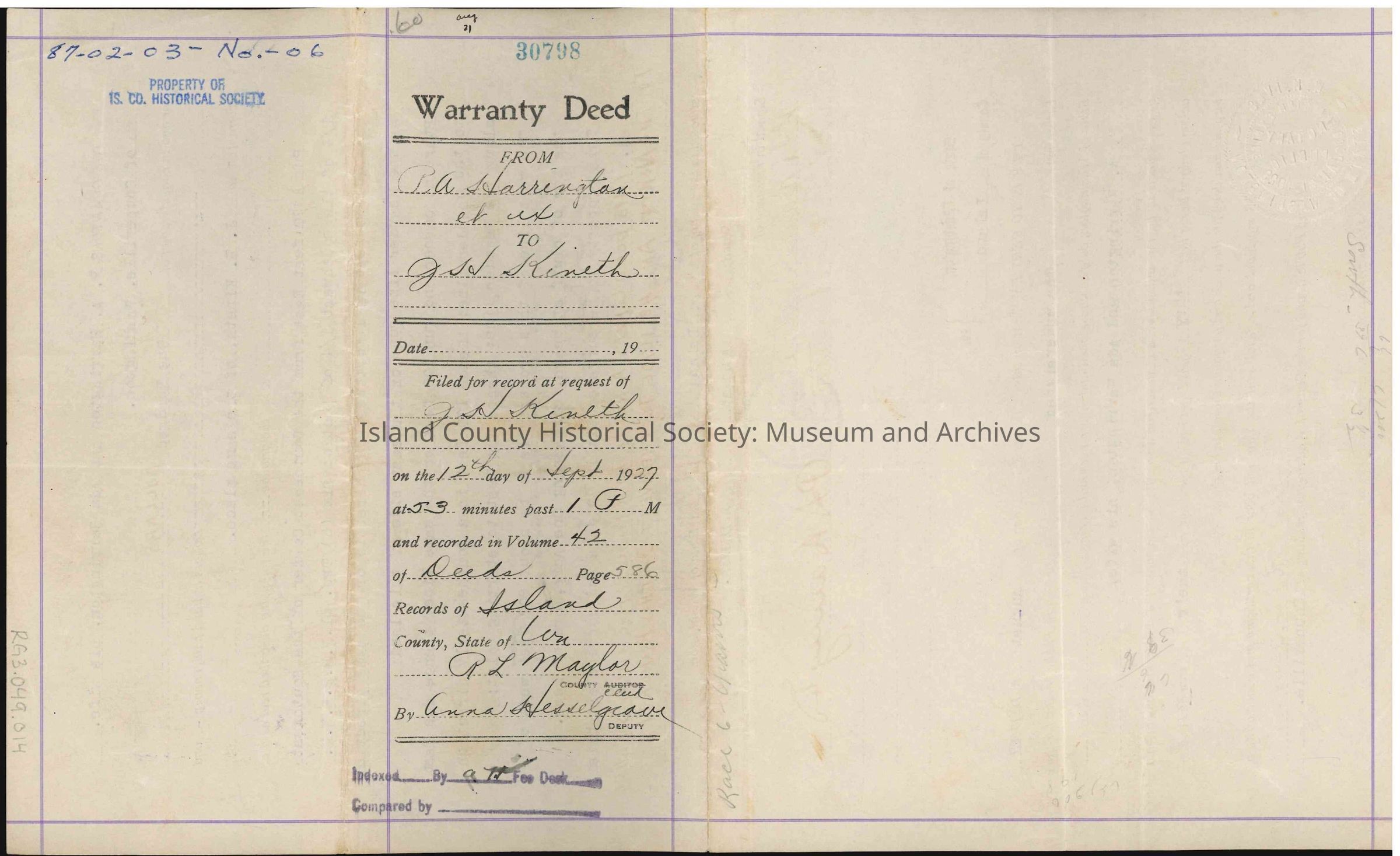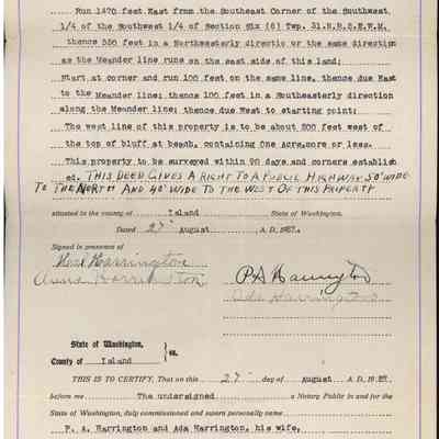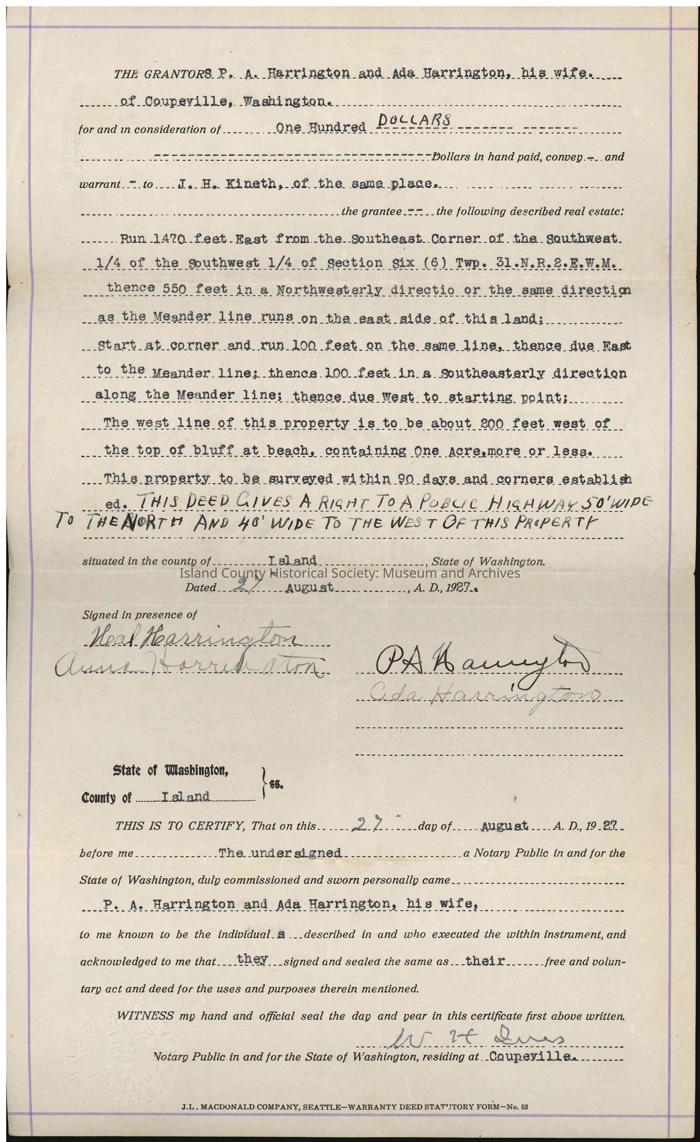 Warranty deed for real estate in Island County, from P.A. Harrington to J.H. Kineth, for a sum of one hundred ($100.00) dollars. Dated 27 August 1927. Published 12 September 1927.