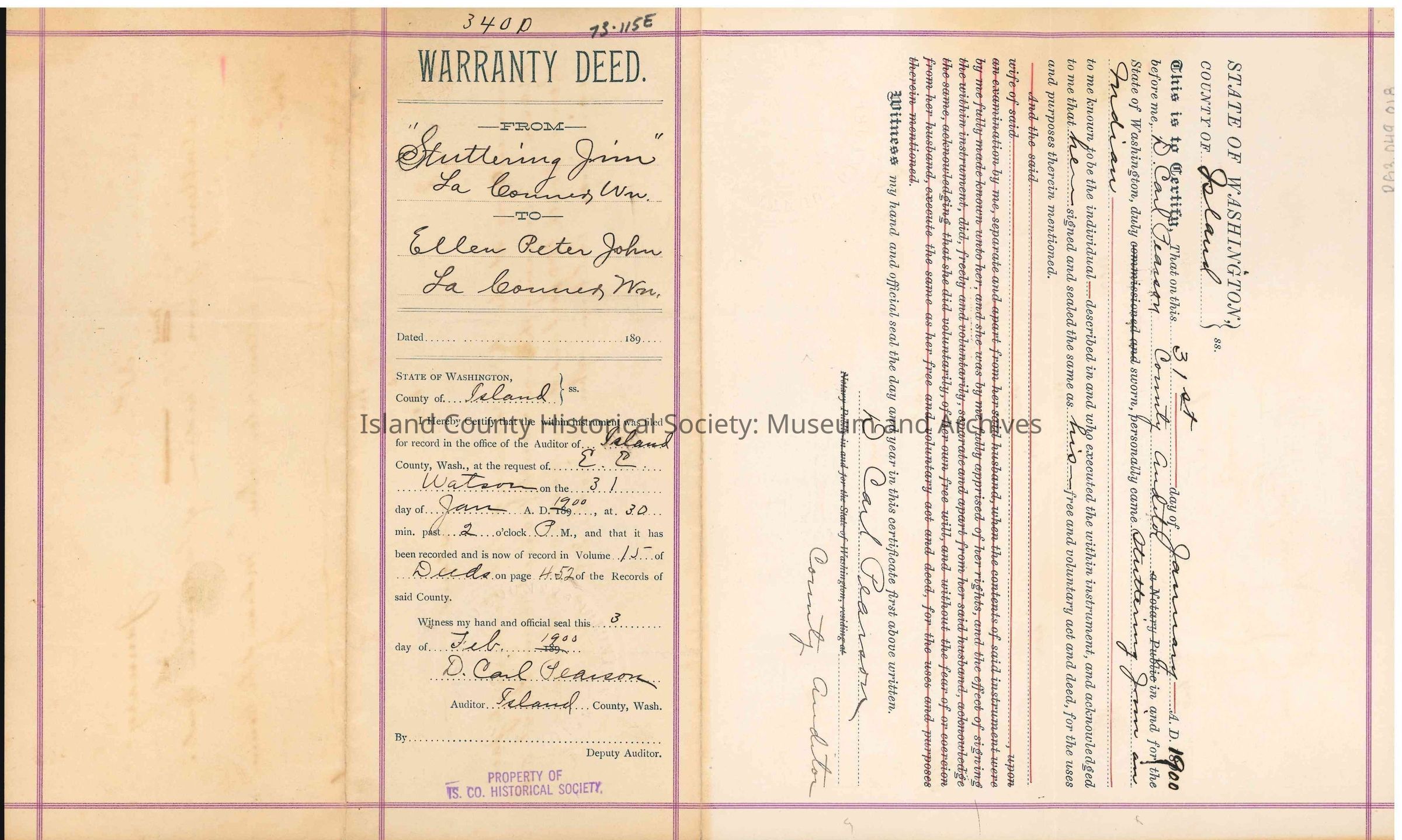 Two of these stamps; one is at bottom of "warranty deed to and from" section, second is at bottom left of witness signature of D. Carl Pearson.Transcription