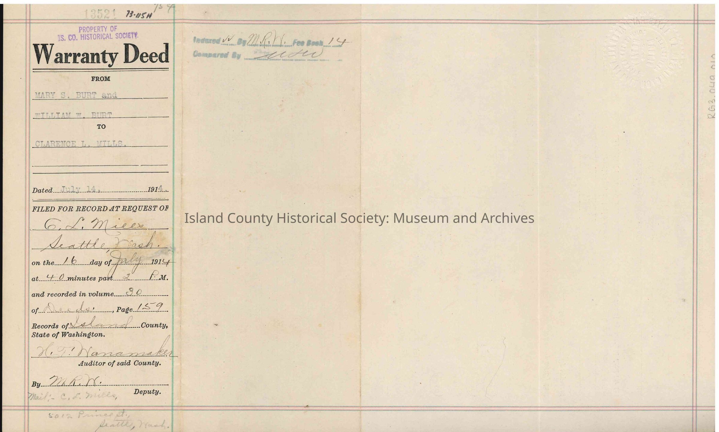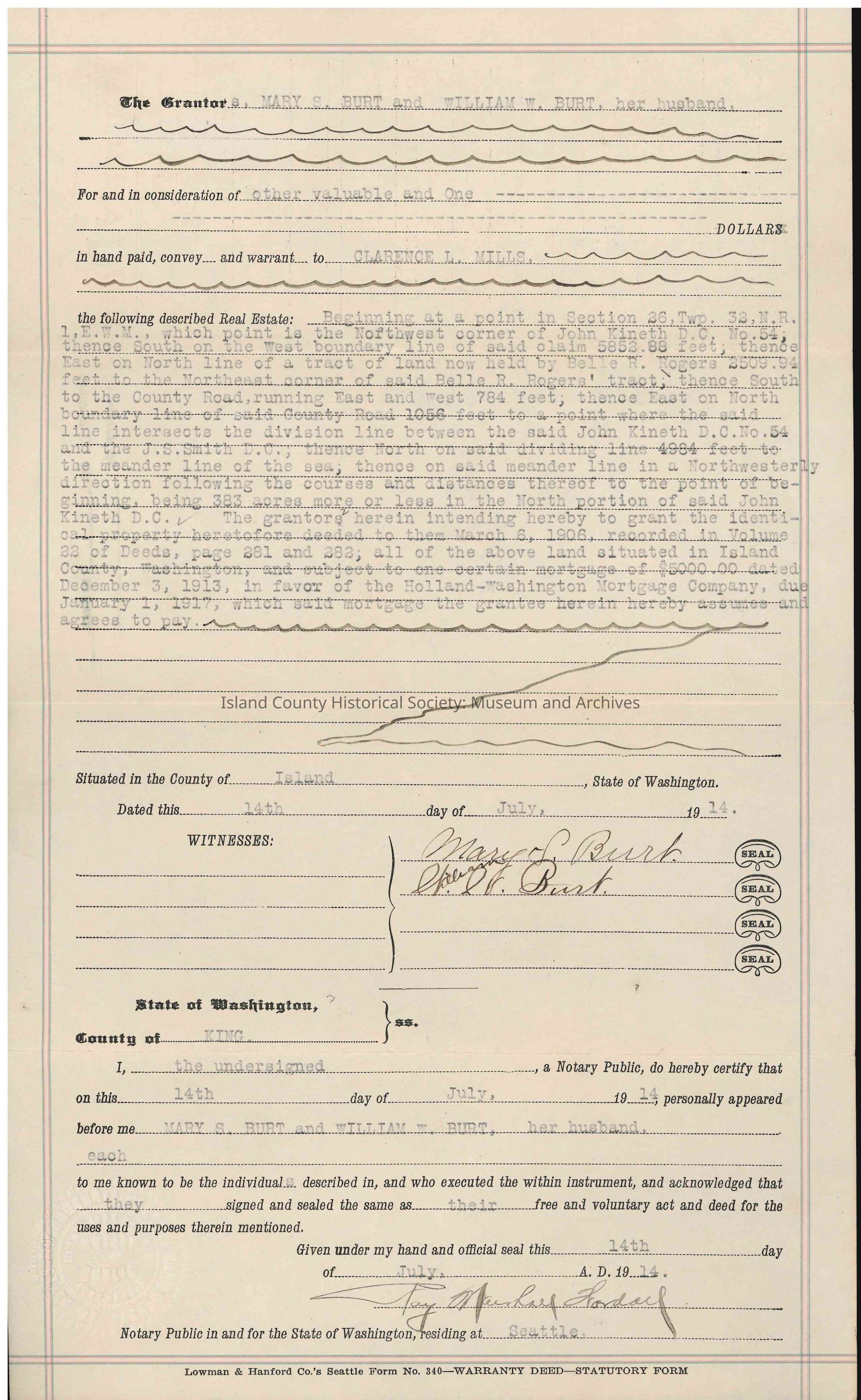 Warranty Deed for real estate in Island County from Mary S. Burt and William W. Burt to Clarence L. Mills, for the amount of "other valuable" and one ($1.00) dollar. Dated 14 July 1914. Published 16 July 1914.