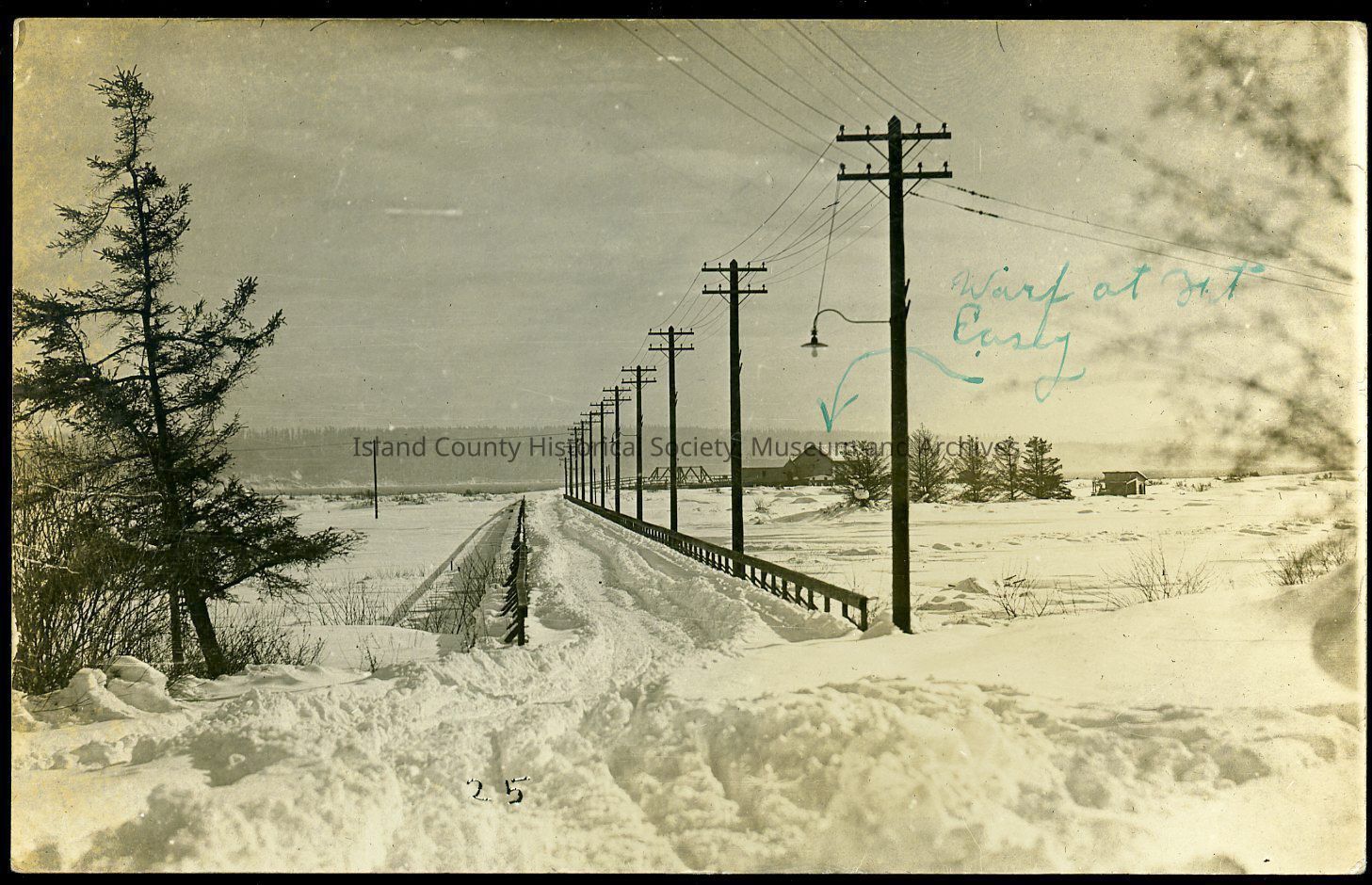 Postcard depicting the wharf (background) and bridge at Fort Casey covered in heavy snow. C. pre-World War I.Collection