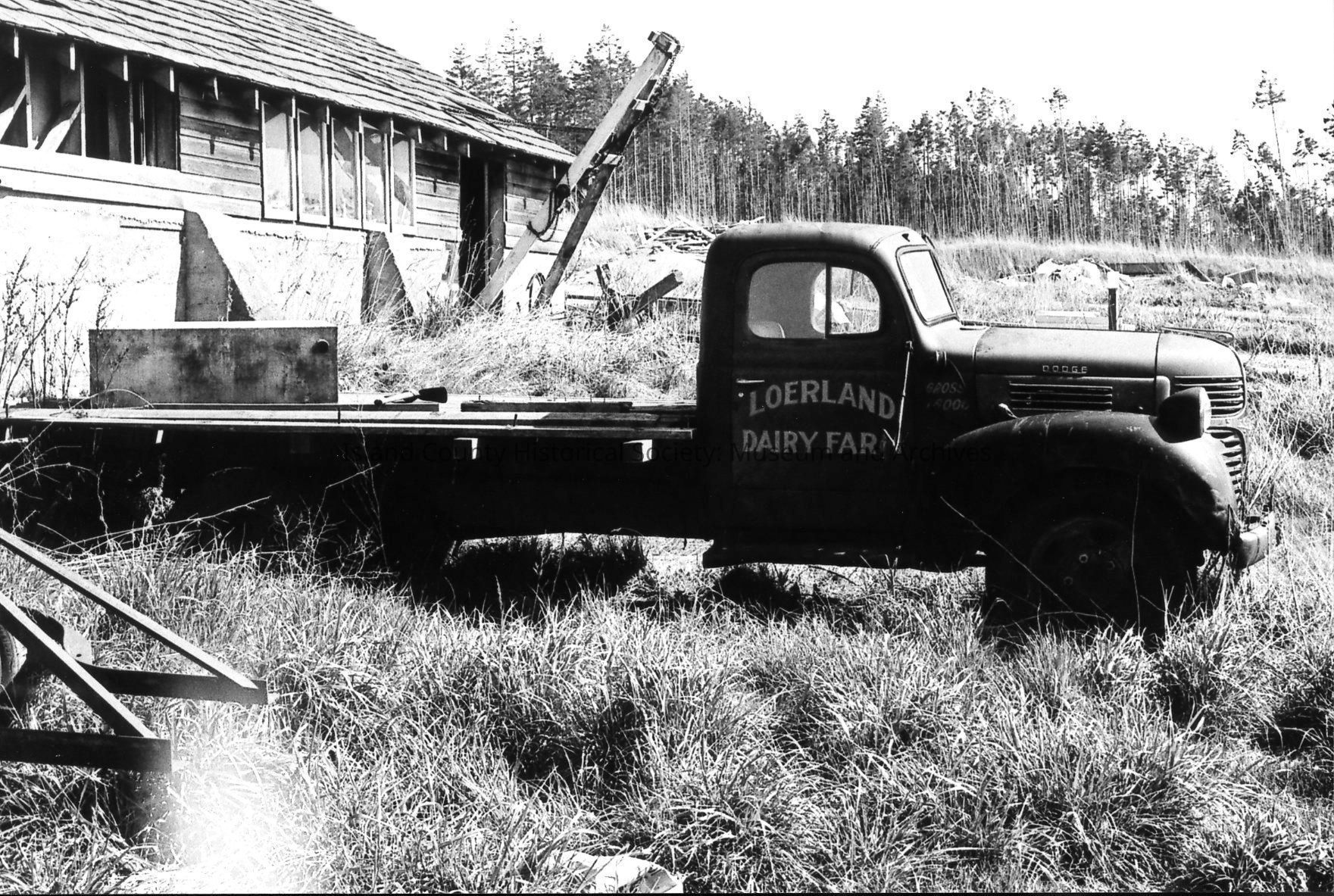 An old truck marked Loerland Dairy Farm sits near an old outbuilding. The Whidbey Golf and Country Club, which formed in 1960, acquired the Loerland farm and constructed the course on the land. The barn was remodeled to a clubhouse.Photograph Details