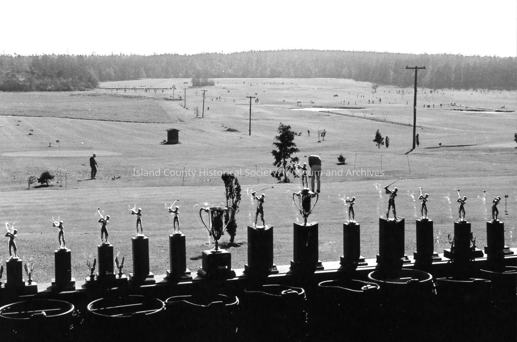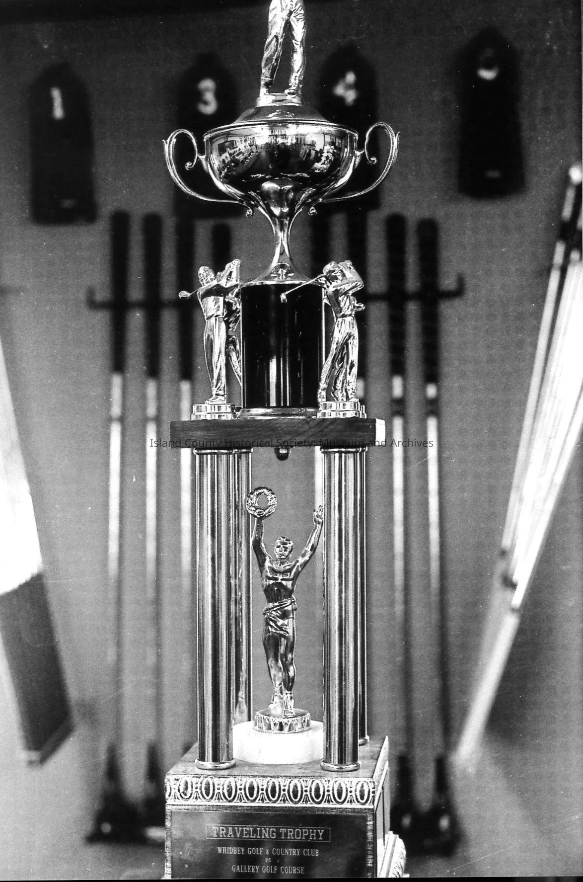 A tall trophy topped with golfers and cup reads: Traveling Trophy, Whidbey Golf & Country Club vs Gallery Golf Club. A long line of smaller trophies sit on a window sill overlooking course and golfers.Photograph Details