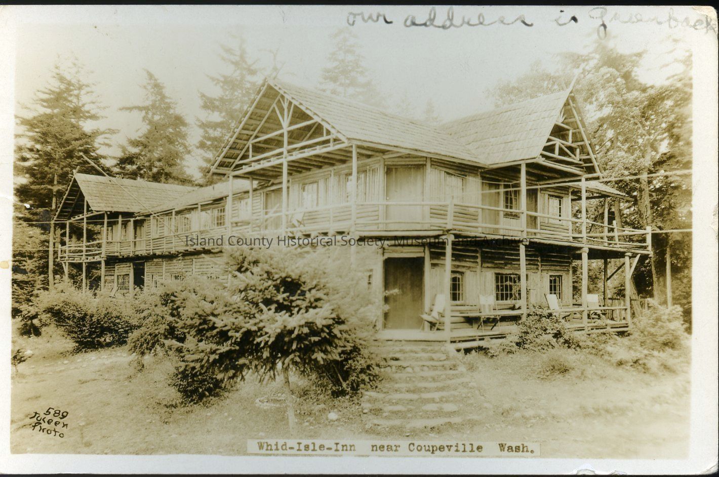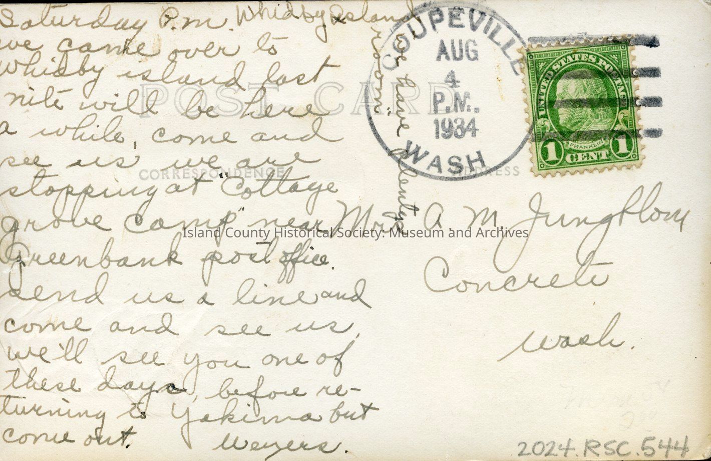 Postcard depicting Whidbey Island Inn (now Captain Whidbey Inn) near Coupeville. Postcard addressed to Mrs A.M. Jungflow of Concrete, Washington. Reverse of postcard reads, "Saturday P.M. Whidby Island. We came over to Whidby Island last nite will be here a while, come and see us. We are stopping at "Cottage Grove Camp" near Greenbank post office. Send us a line and come and see us. We'll see you one of these days, before returning to Yakima but come out. Weyers." Postmarked 4th August 1934, Coupeville.Collection