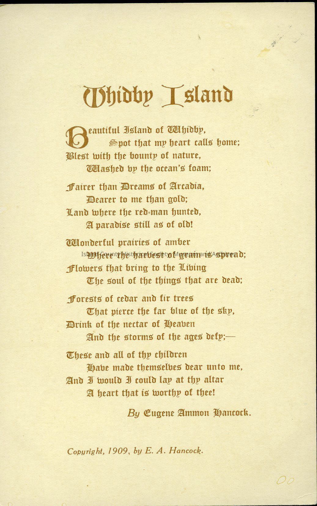 Postcard sent by E.A. Hancock regarding a New Years eve meeting, featuring a poem by the sender on the front. The handwritten message on the reverse reads, "The second annual New Years Eve meeting of the CH. S.A.A. will be held at the residence of Mr. & Mrs. Clark, Friday evening Dec. 31, '09." The postcard is written and signed by Mr. Hancock's secretary, and is postmarked Coupeville, Dec. 30, 1909. CH. S.A.A. is presumed to be the Coupeville High School Athletic Association.Collection