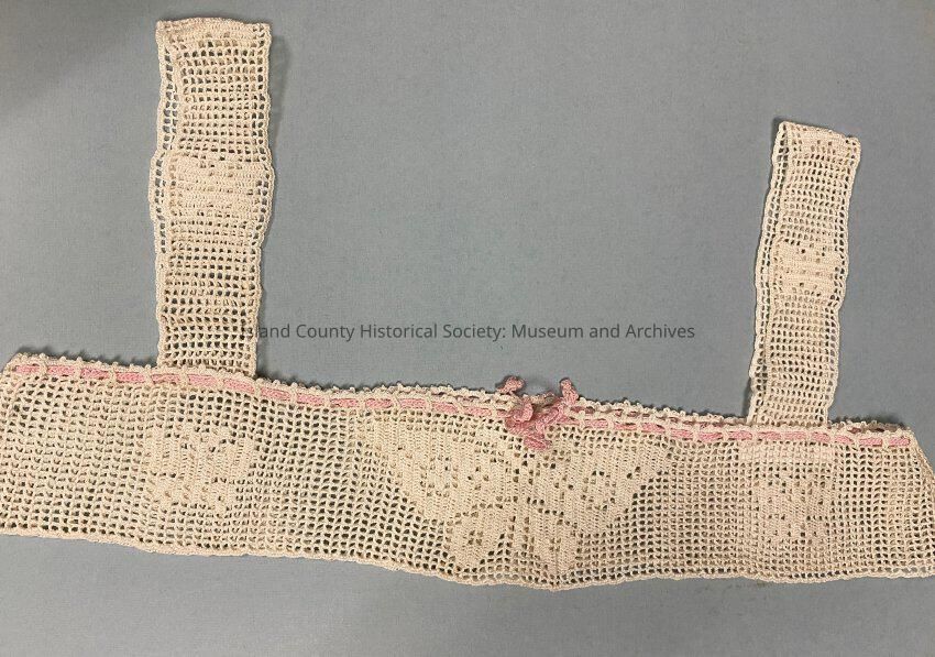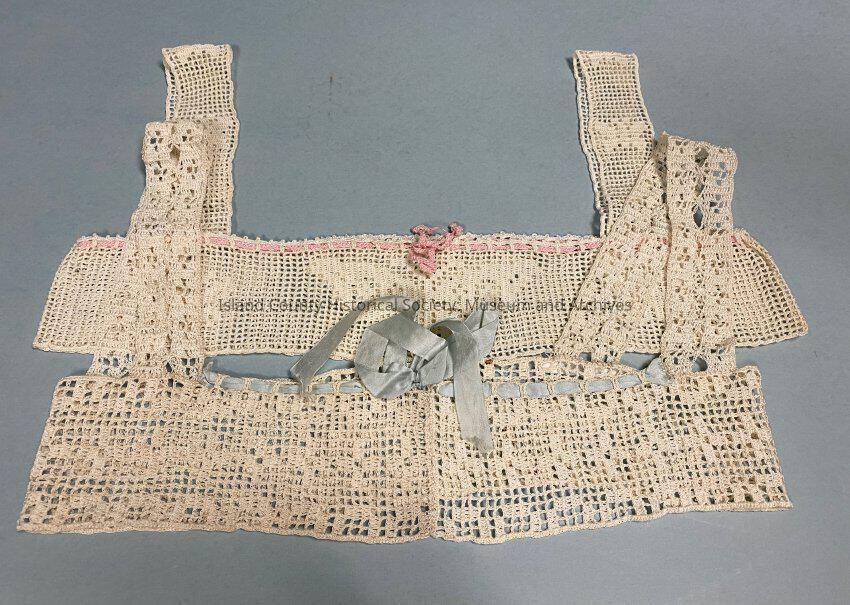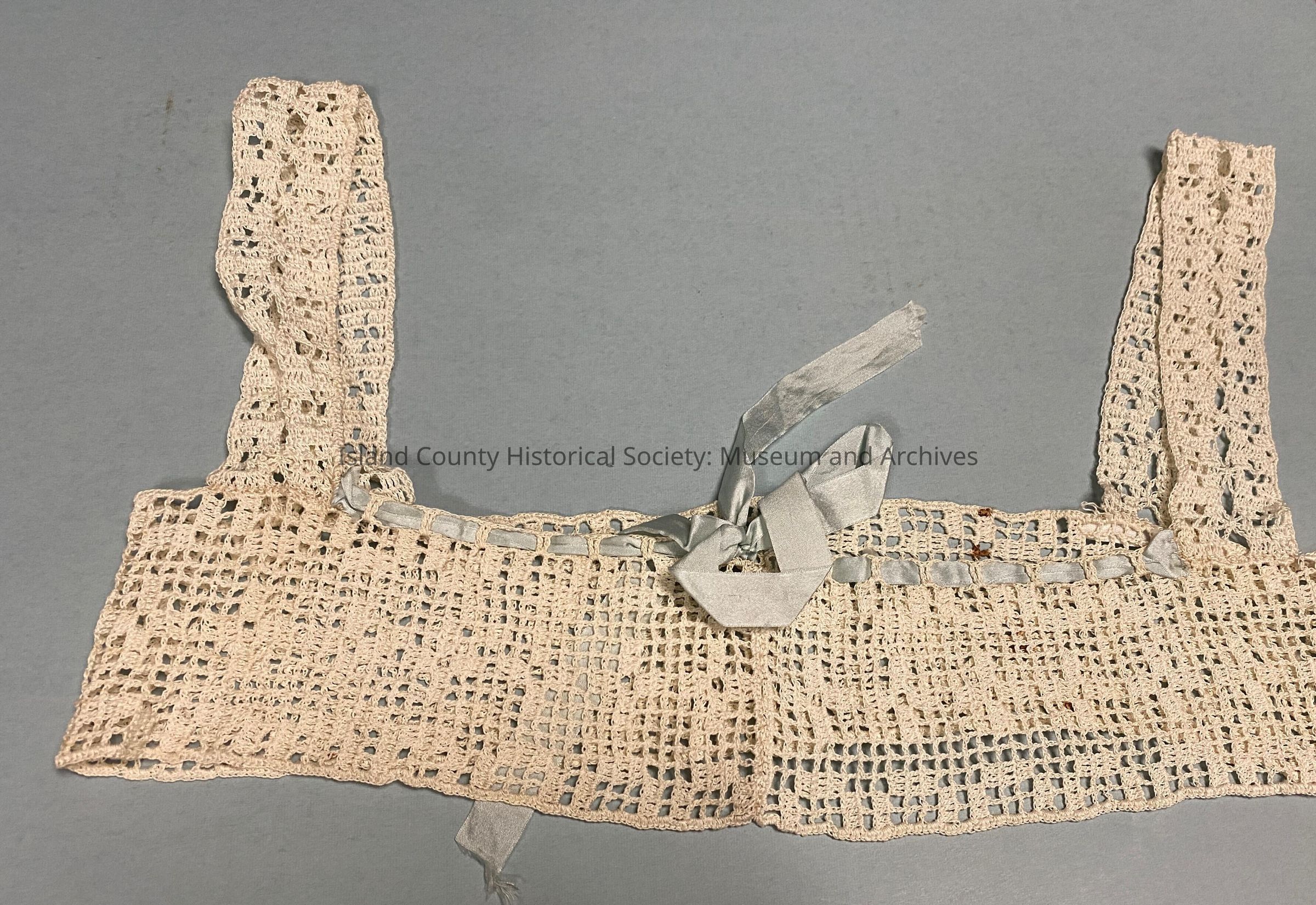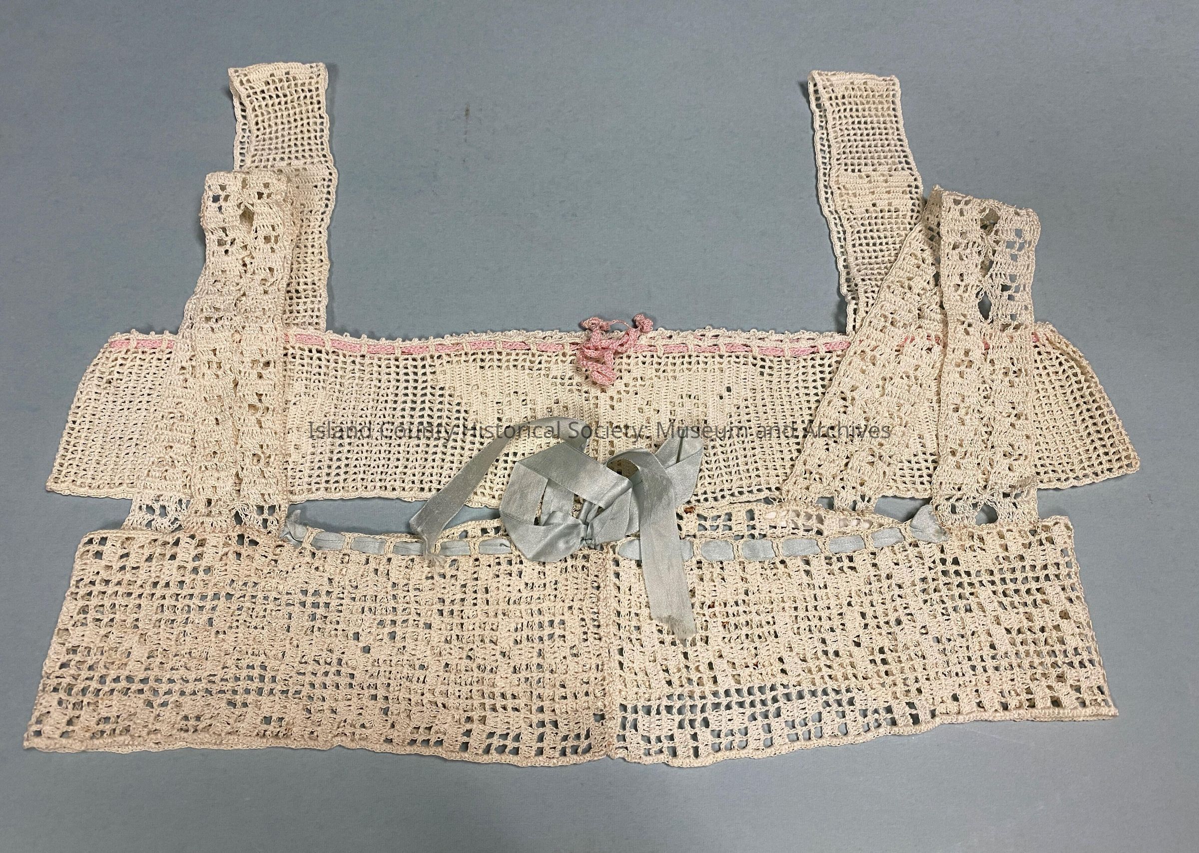 2 Crocheted White Yokes, one with pink crochet tie, one with blue ribbon tie; graduation gifts to Ethel Libbey