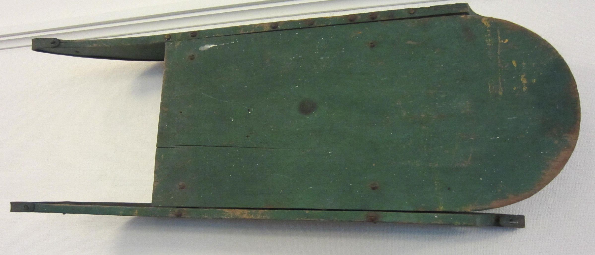 29 1/2 inches x 10 5/8 inches x 5 inches. Single plank, round in the rear, forms top 20 3/4 inches x 9 1/2 inches. The top is supported by 2 smaller pieces of wood, through tenoned into single planks that form running gear. Running gear is shaped at each end. Sled runners are made of iron and wrap up over both ends of running gear. Top of sled, bottom of supports and running gear are painted green.