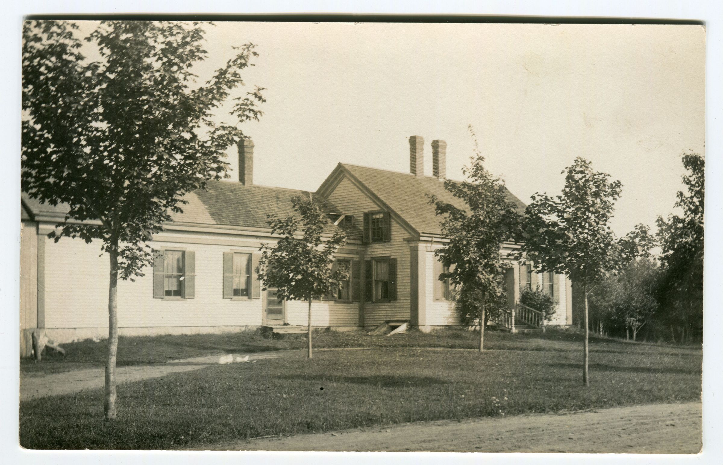 Postcard showing Morris Decker house. 1.5 Cape, two center chimneys, Greek Rev. trim, ell with one chimney. Young trees in front yard.