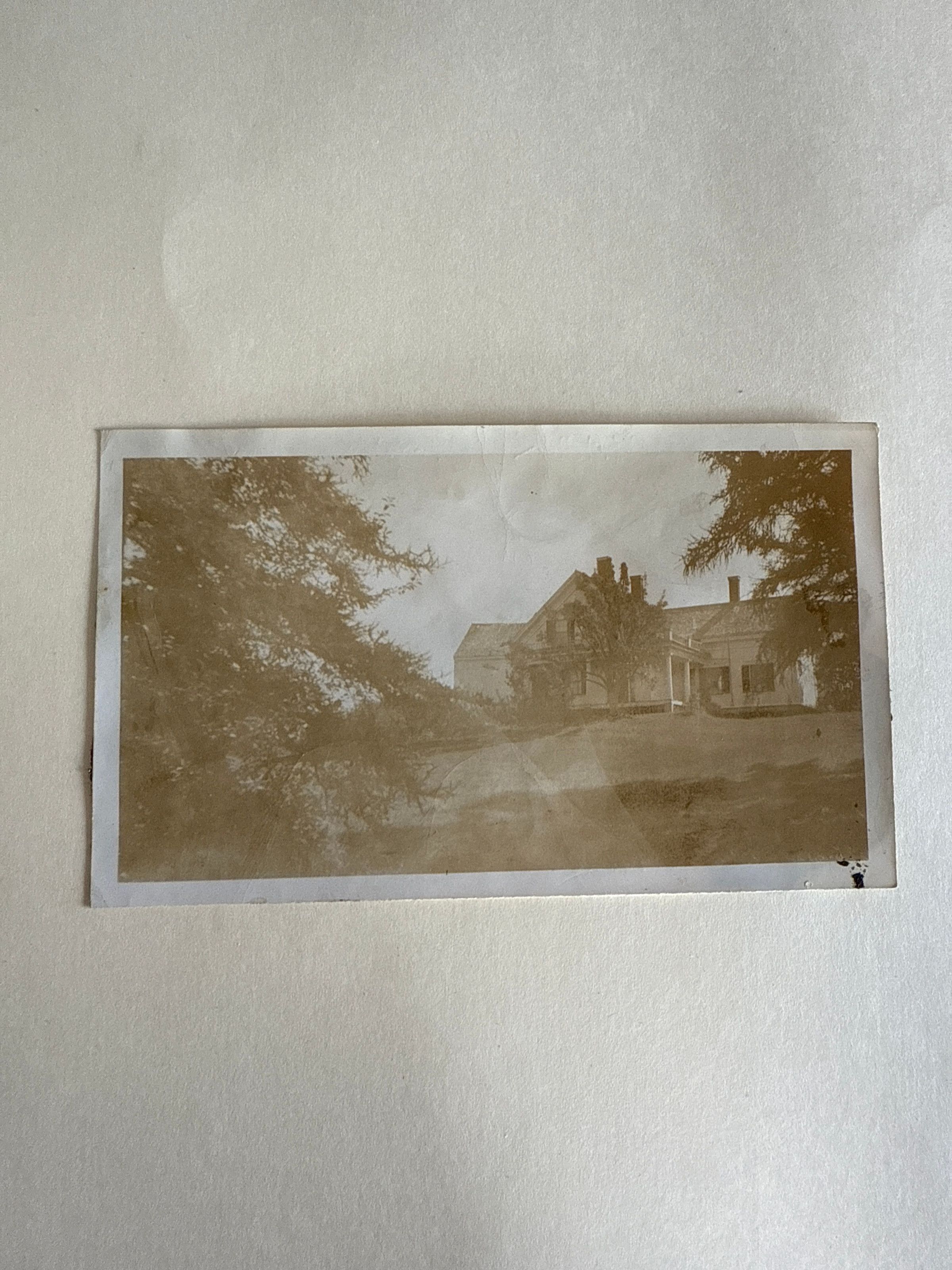 Old snapshot 3.5x6" of 1.5 Cape, Greek Rev trim, 3 chimneys, ell with covered porch, barn behind, on a slight hill. On back is written "Mark Pierce Pendleton's"