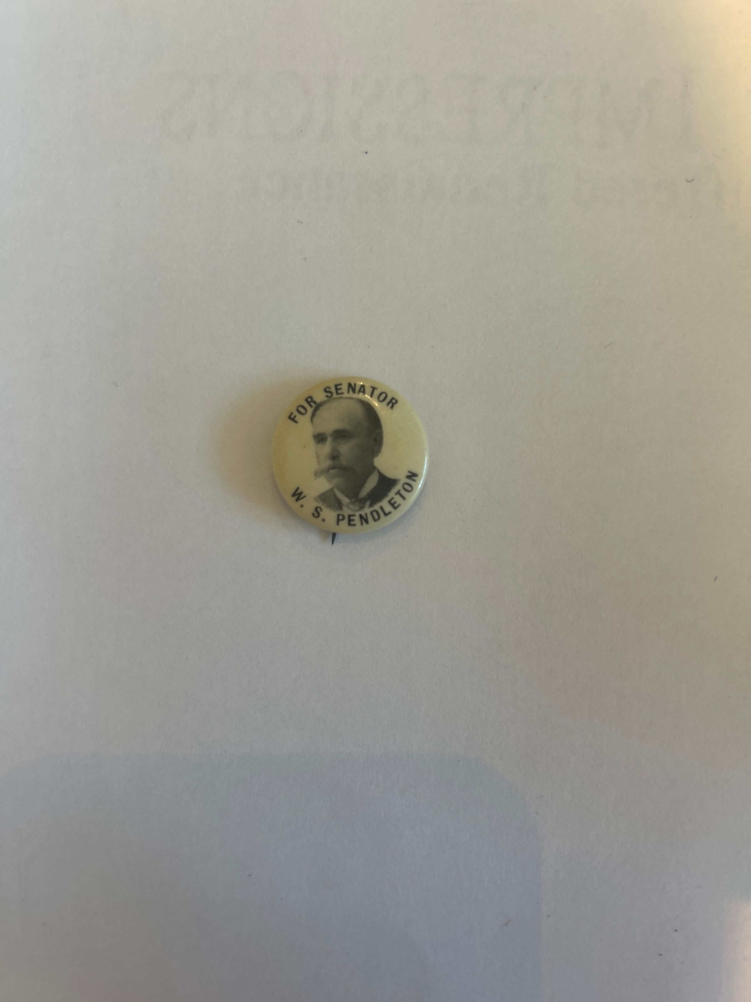 1 7/8 inches round. Button shows photographic portrait of Winfield Scott Pendleton Original Inscription: For Senator W.S. Pendleton Date of Origin: c 1910