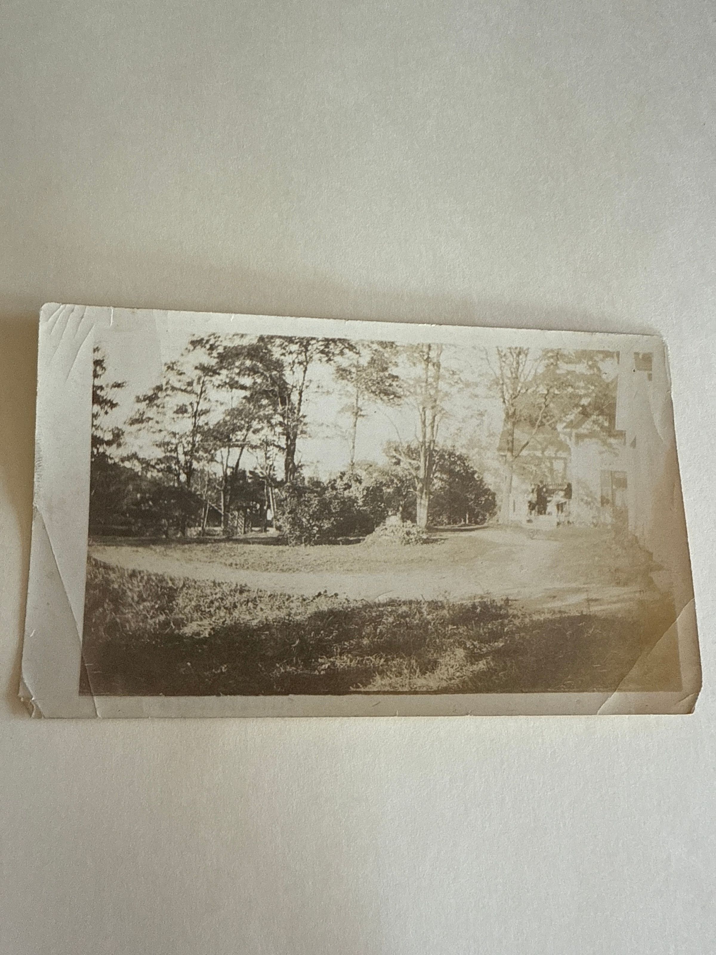Snapshot, badly light-struck, of house (probably Pendleton/Babbidge) from barn across front porch. On back "Our farm and house Islesboro, Maine"