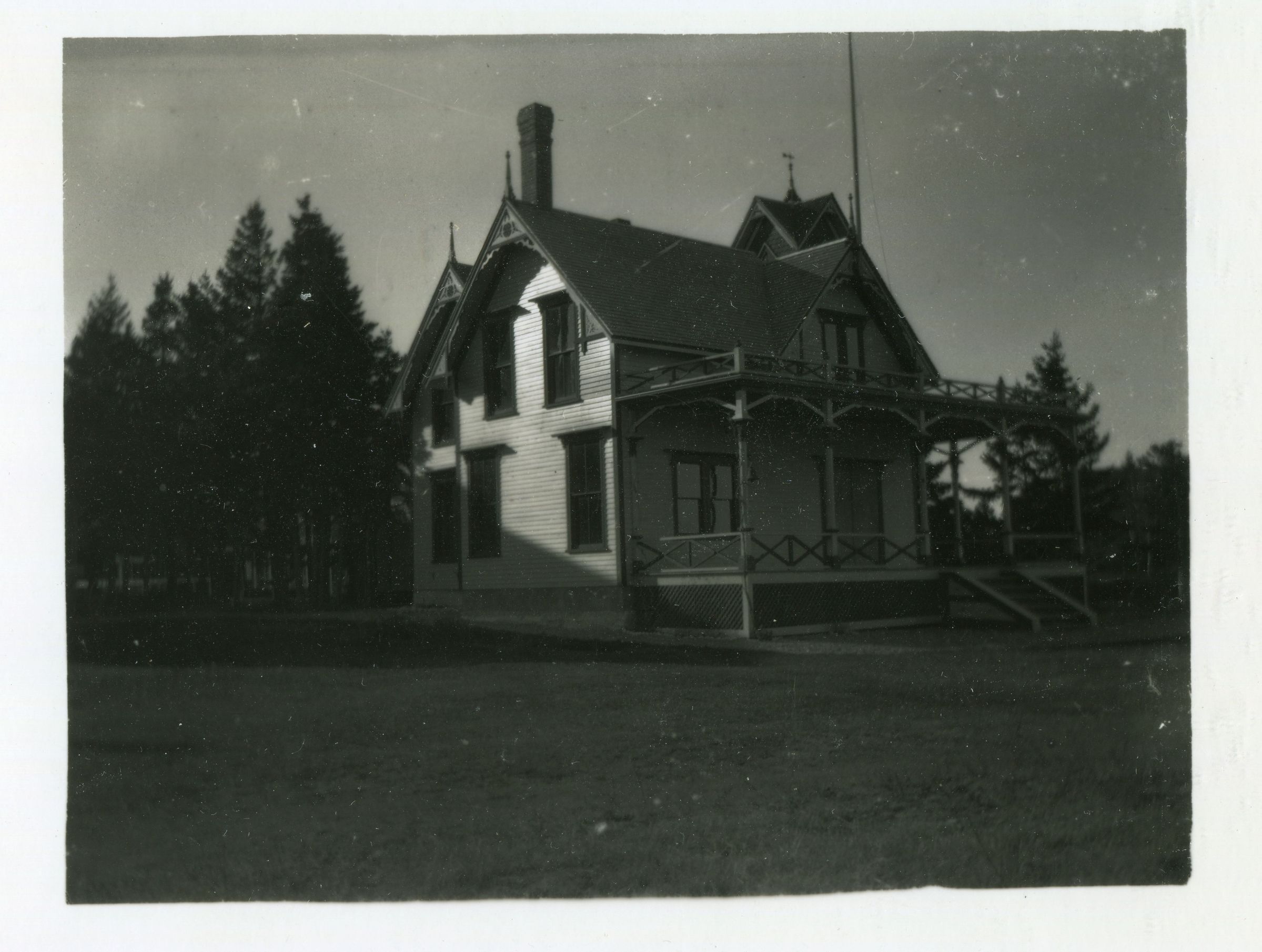 Print 5x7"of picture of late Victorian style house, 2-storey, cross-gabled, with highly decorative front porch, and either a cupola or turret on side away from camera. On back "Mrs Thayer. Built by Frederick Jones"