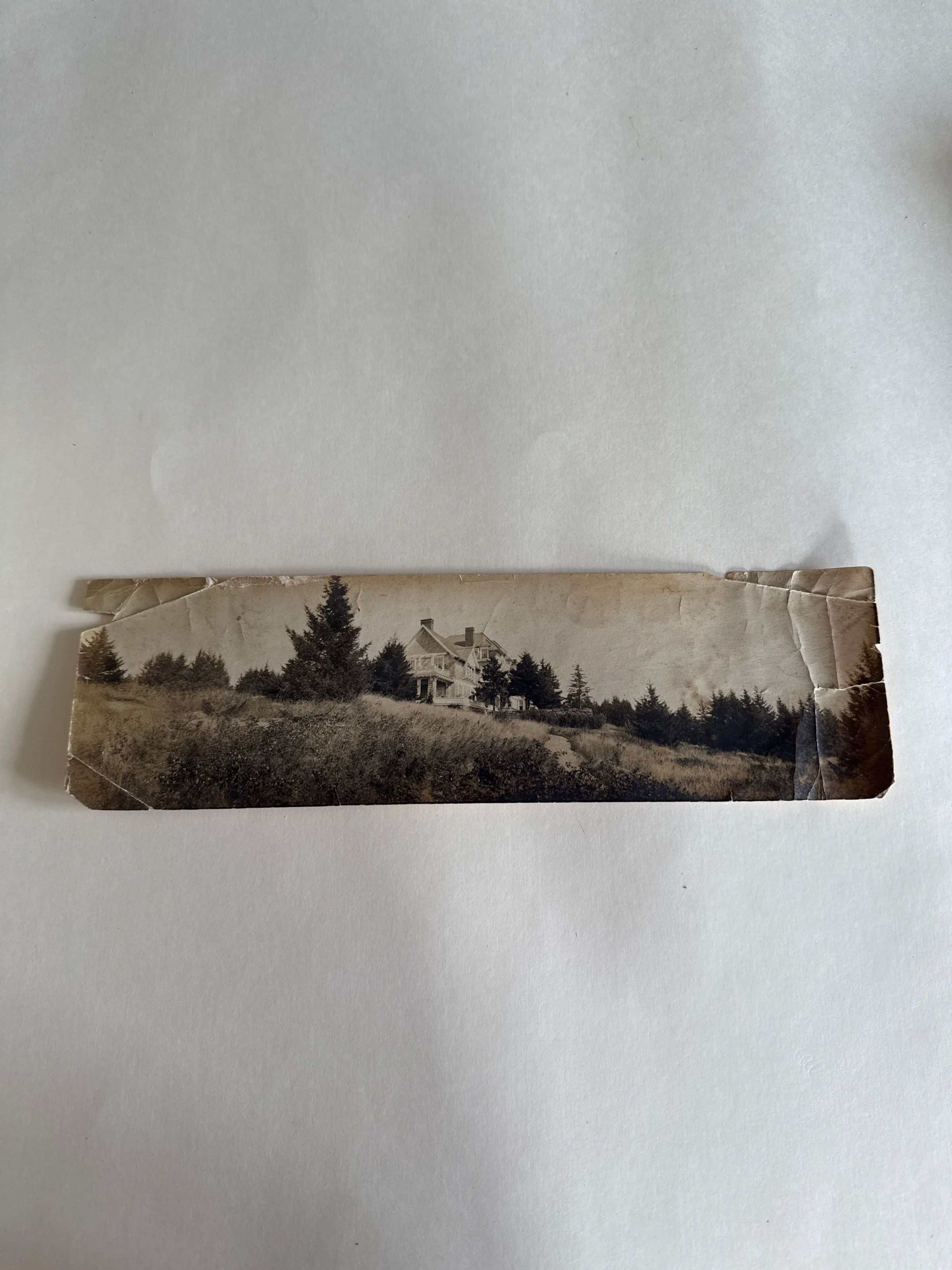 Photo 3.5" x 11.5", sepia, of large 3-storey gabled house on a hill. On back "Jeffrey Brackett Cottage 1888 - 1st cot on island"