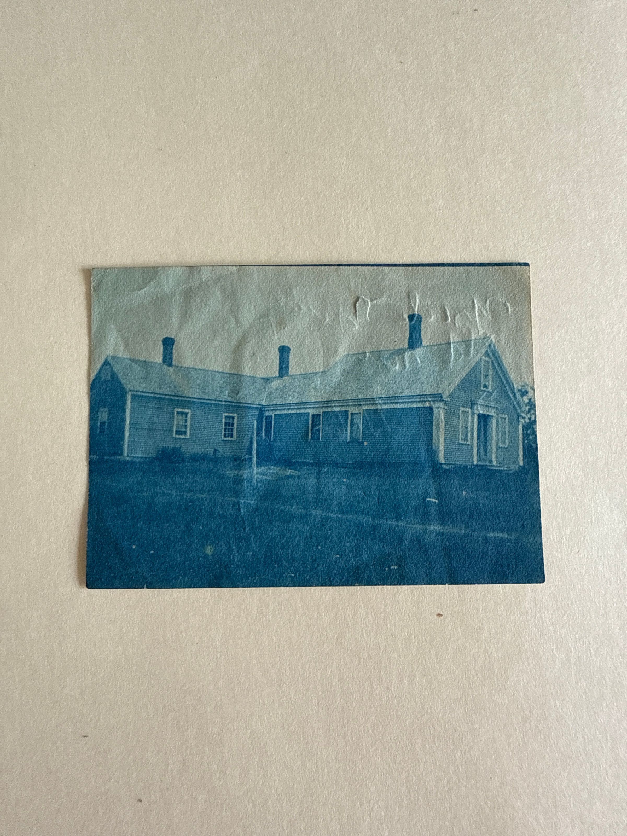 Small snapshot of 1.5 Cape with two smaller additions, 3 chimneys, front door at gable end, clapboard. On back "Henry Coombs House, stood where Heber's house is now, opposite Meadow Pond Road. This house stood when Heber King's house is. Ed & Amy Pendleton"