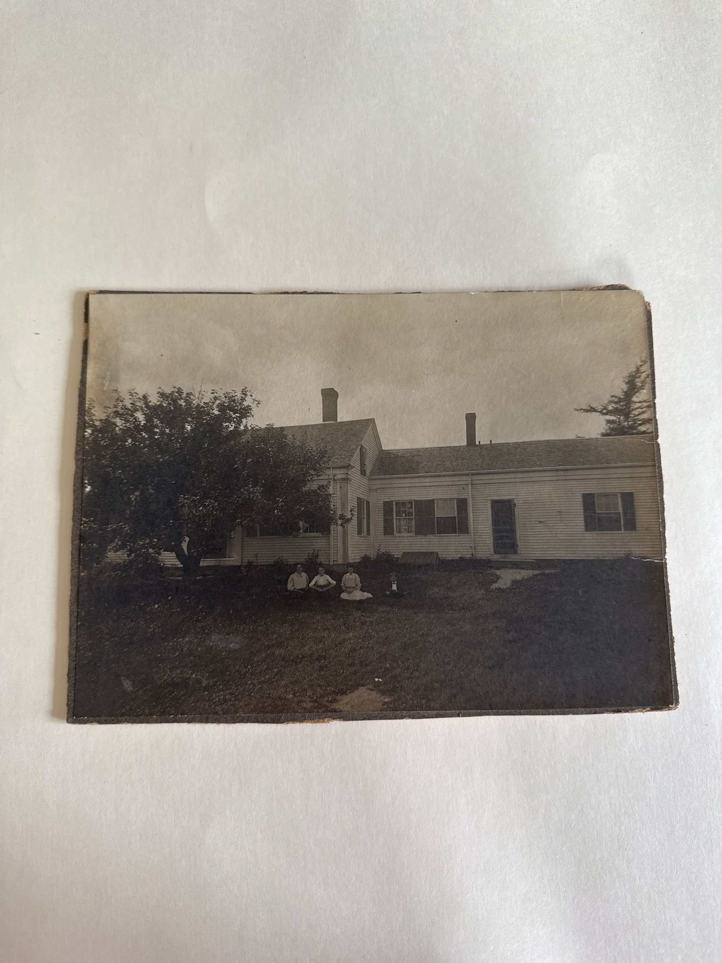 Sepia picture 6x8" of white clapboard 1.5 Cape, Greek Rev. trim, with elongated ell. 3 chimneys. Four people seating on lawn in front. On back "Now Hilda Addenbrook"