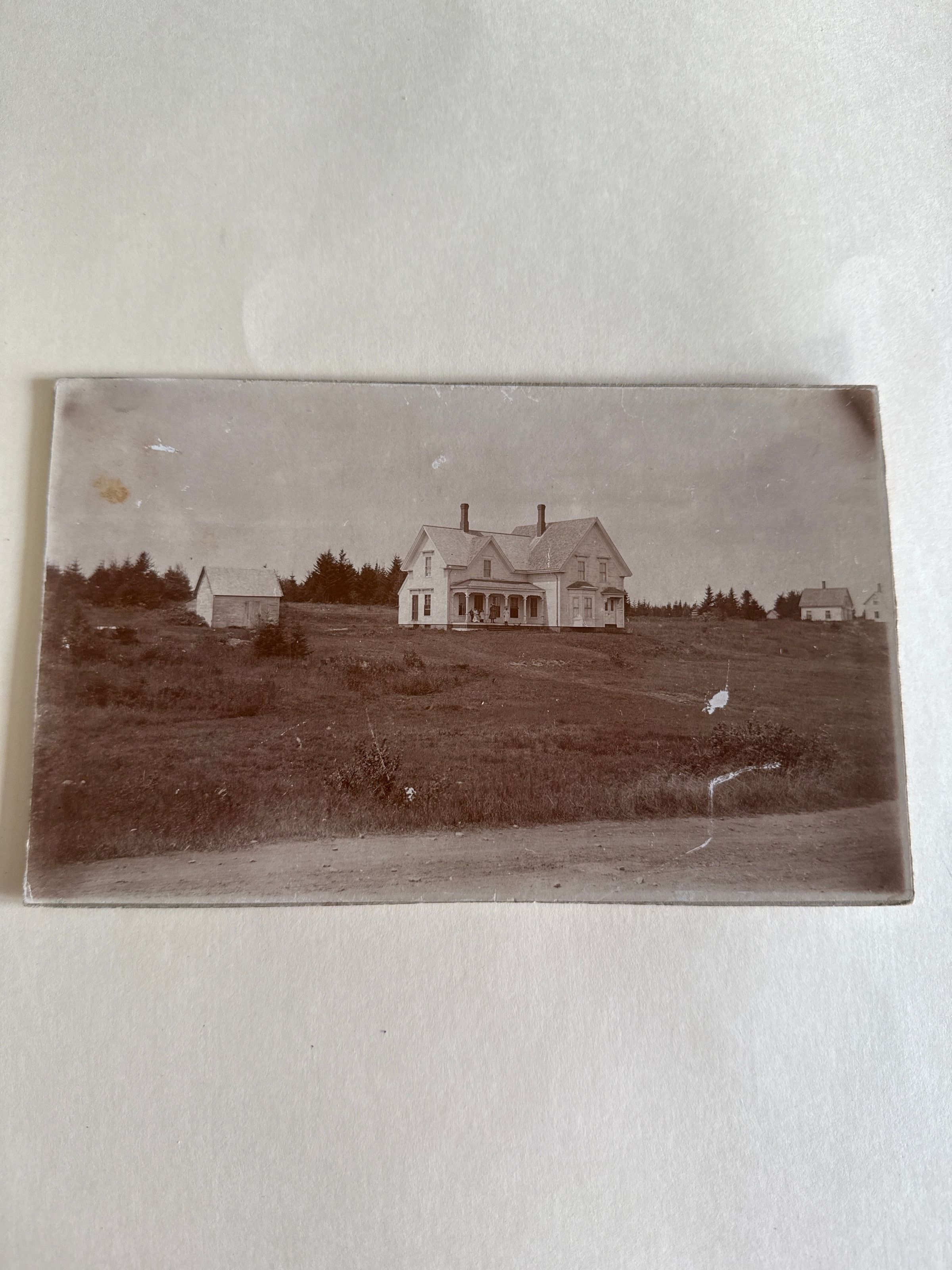 5x8 sepia print showing a 2-storey cross-gable island-style house with bay window on gable end of one leg, a decorative porch on long side of ell. Two chimneys. On a hill. In background two smaller houses, plus a small structure on the left side of main house. On back "Joe Dodge - 1st owner. Paul Palmer 1960 - Earle McKenzie 1976." House in No. Islesboro, west side.
