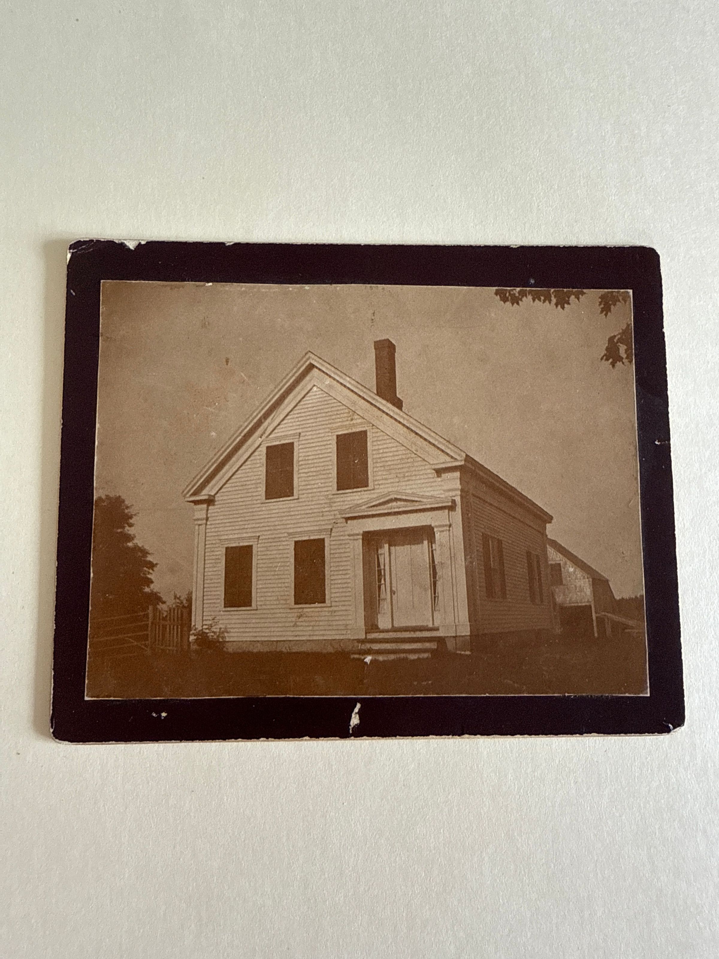 Photo 4.25x5.25" of a 1.5 Cape, center chimney, Greek Rev. trim, ornately pedimented front door on side of gable end with two windows, two windows above on 2nd floor. Barn in back. On back "Sherman House on the West Side" and "Eva Pendleton." Could also be one of the two houses to the south of Eva Pendleton's house (now Crate).