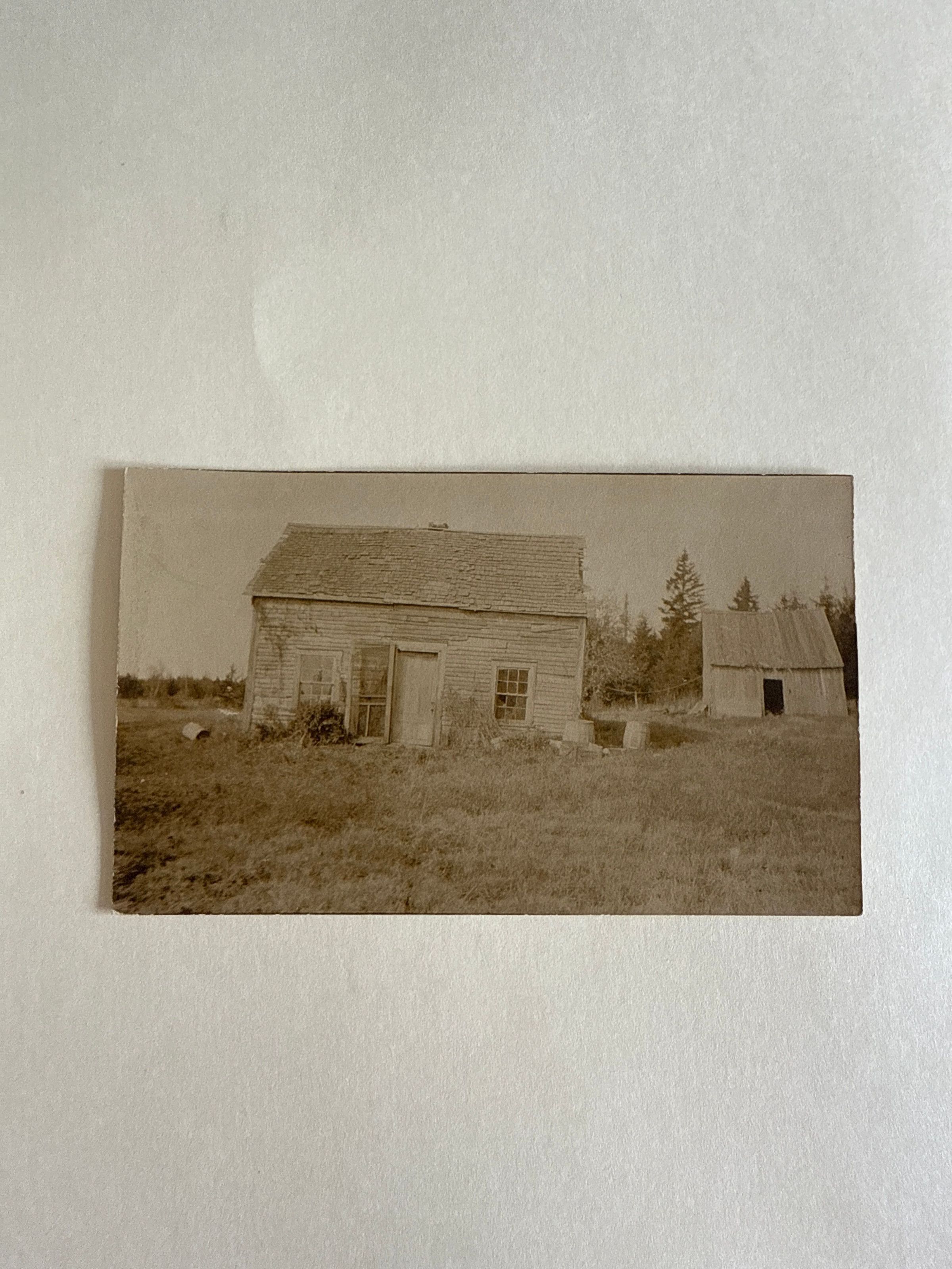 Postcard photo of dilapidated house and small barn in a field. On back: "Lyman Green Pendleton Home"