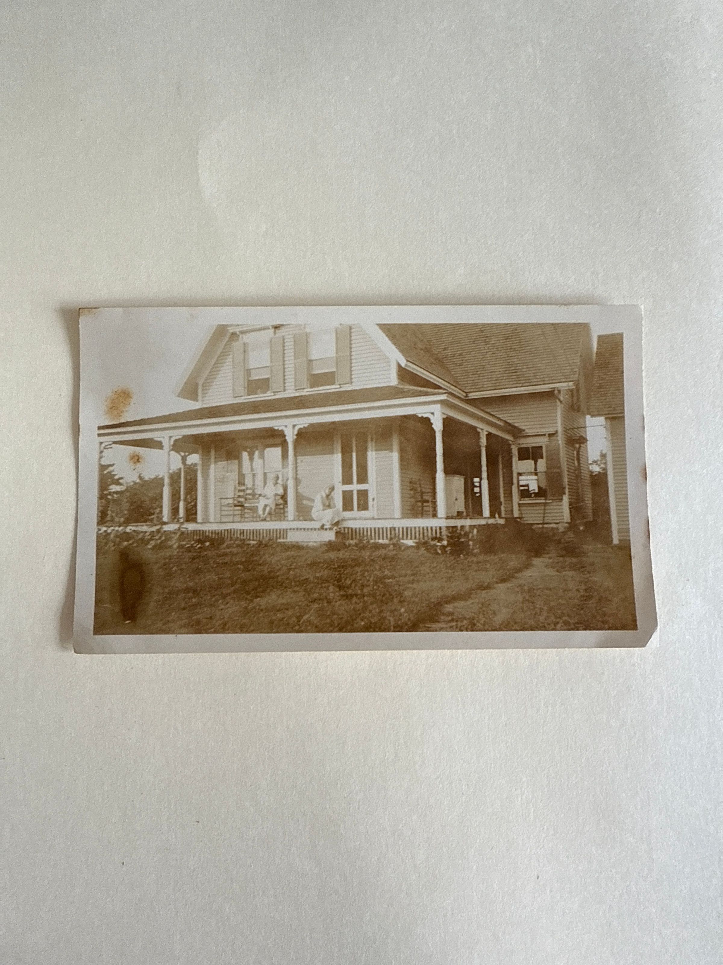 Snapshot of an "island style" house, 2-storey, wide overhangs, cross-gabled, heavy pediments over windows & doors, clapboard, porch with turned posts. Two women on porch. On back "Yellowhammer - 1996 Phillip Staples house - Alice L Pendleton may have lived here." Per Mary Ella Rolerson Grinnell this house was originally owned by Joseph Pendleton, then by Alice Louise Pendleton (of the Library) who named it "Yellowhammer" for the bird, as she was a lover of nature.