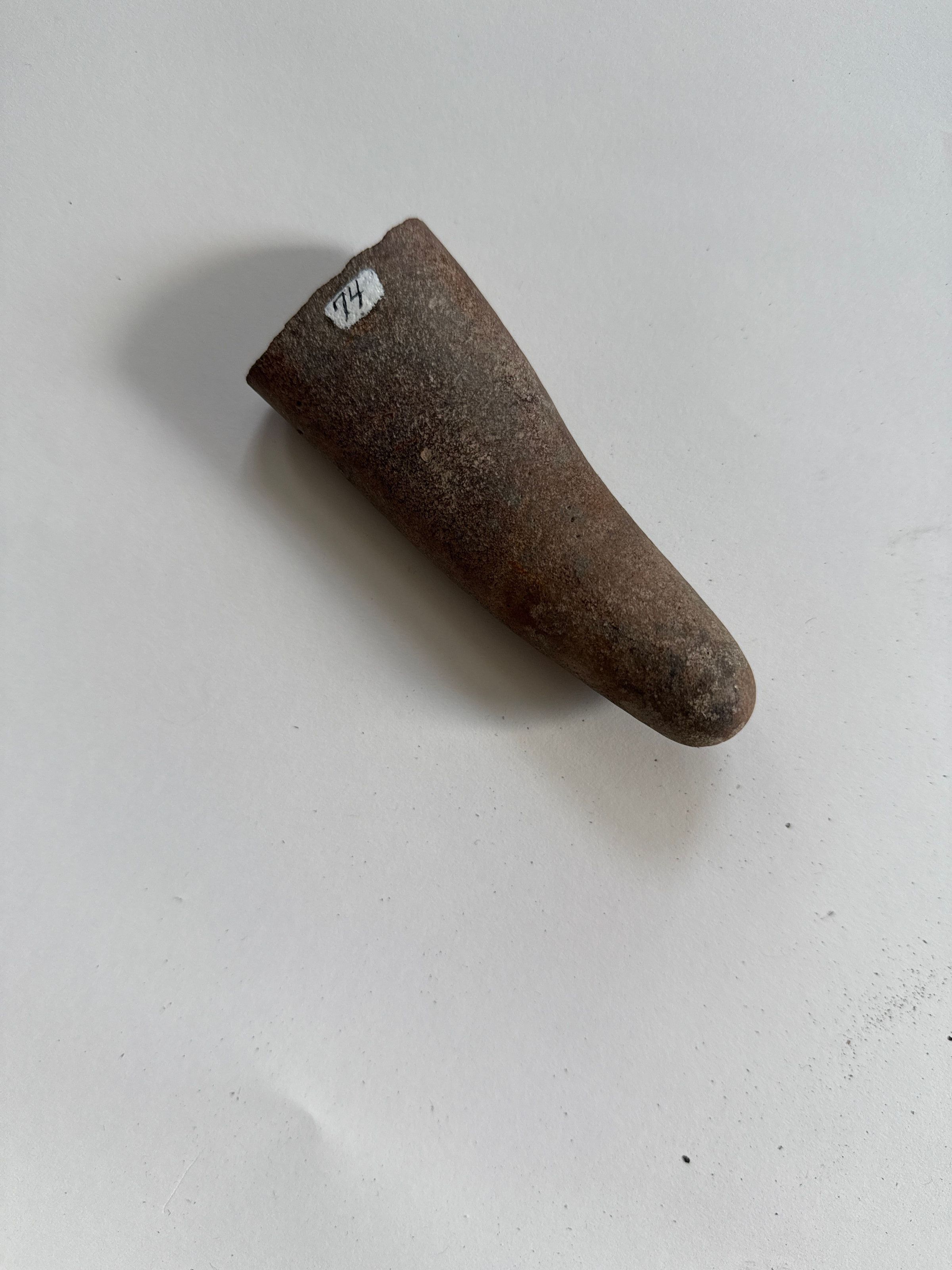 4 1/2 inches x 1 3/4 inches x 7/8 inch. Brown & tan colored stone, very smooth except at base where it appears to have been broken.