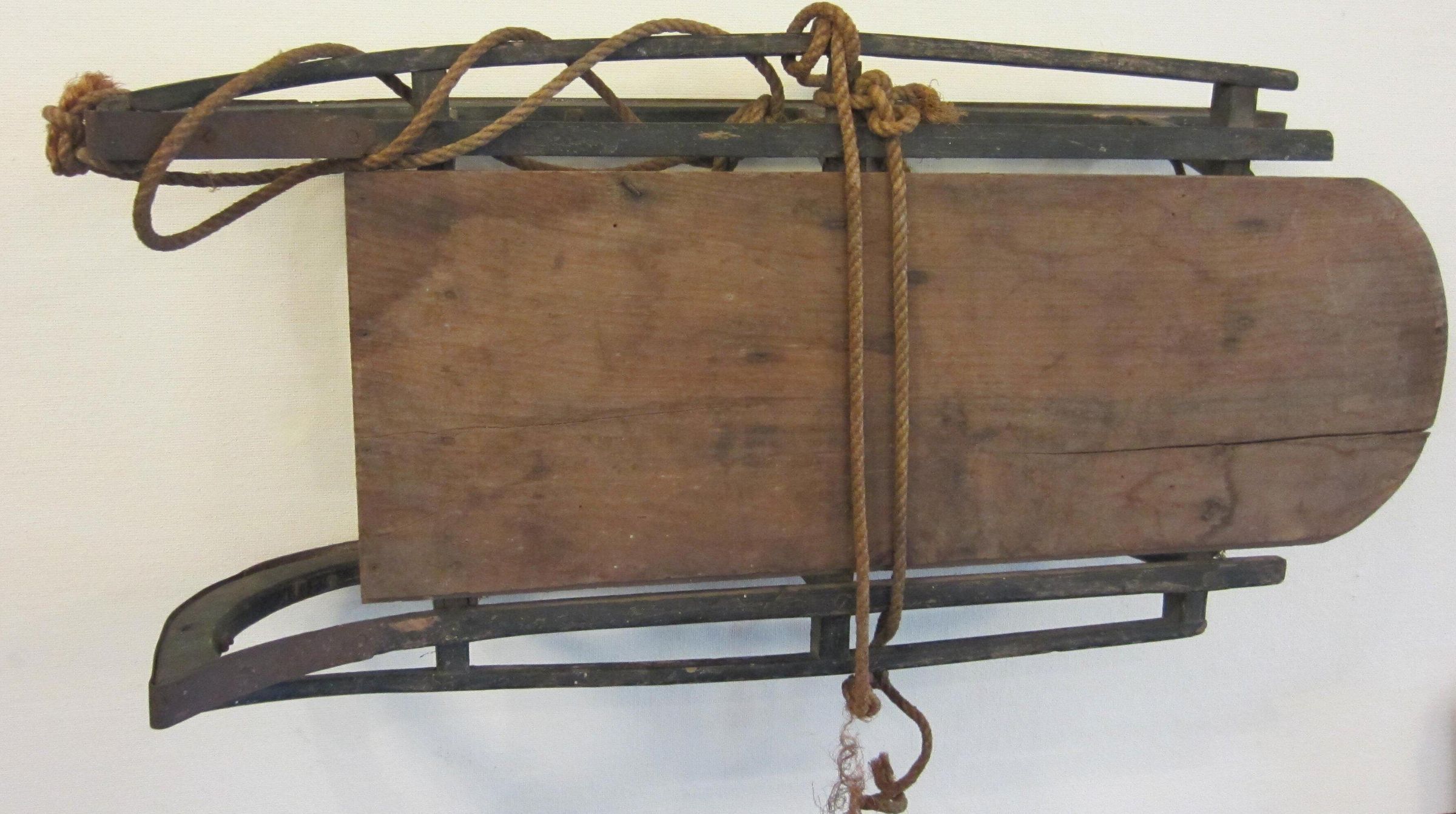 32 1/2 inches x 15 3/4 inches x 9 1/2 inches. Single natural wood plank, rounded at rear end forms top of sled 28 1/4 inches x 9 1/2 inches. Top board of sled is supported by framework of wooden pieces painted dark green. This framework also forms sled runners. Runners are iron which wraps up over front of runner, and in rear is bent into a decorative circle. Top board is nailed to framework, rest of framework is held with screws. Hemp rope is tied around middle of sled. Another piece is attached to one front runner.