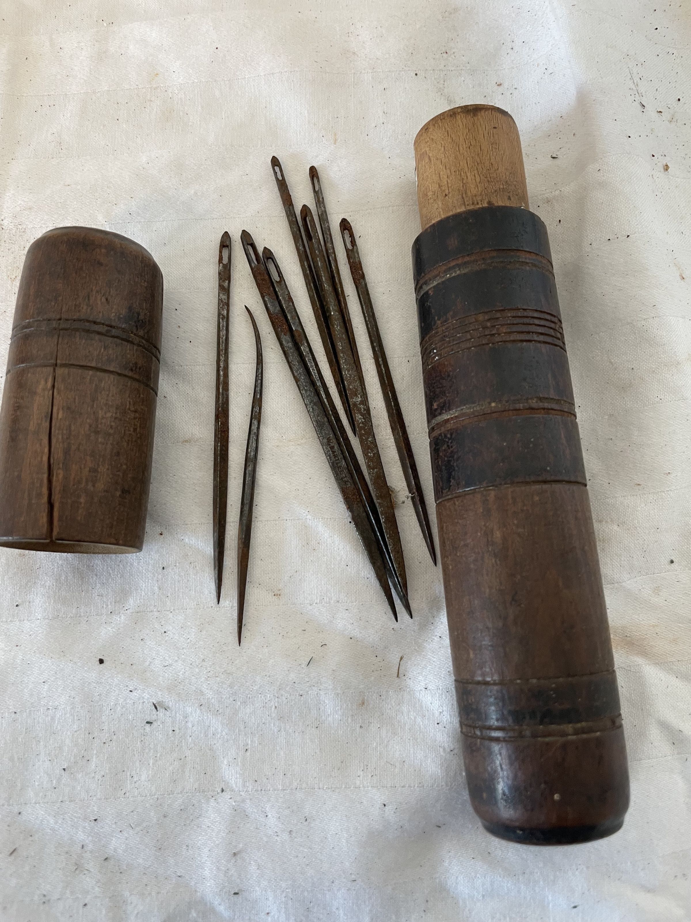 A wooden case to hold needles for mending and making sails. It contains a handful of needles that were used on a ship. The case is swollen