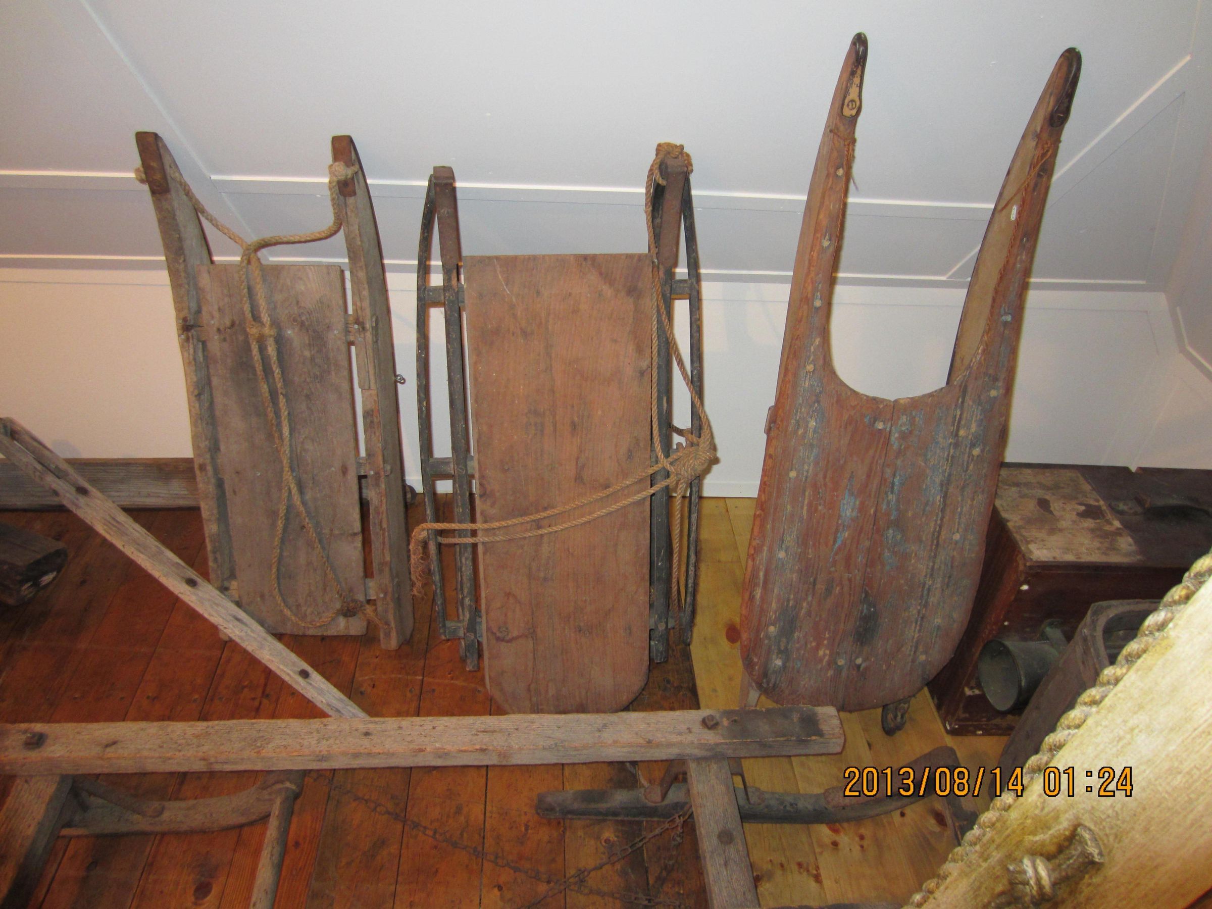 39 1/2 in;ches x 13 1/2 inches x 5 1/4 inches. Top of sled is made of two boards with deep indentation at front and rounded in the rear. The top is supported by two smaller boards which are through tenoned to running gear. Each side of the running gear is one board rounded and shaped at each end. Sled runners are tubular iron flattened at both ends and wrapped up over running gear. Holes at front of running gear hold pieces of hemp twine now broken. Held togethr with screws and a few nails. Evidence of yellow (tan) and blue paint.