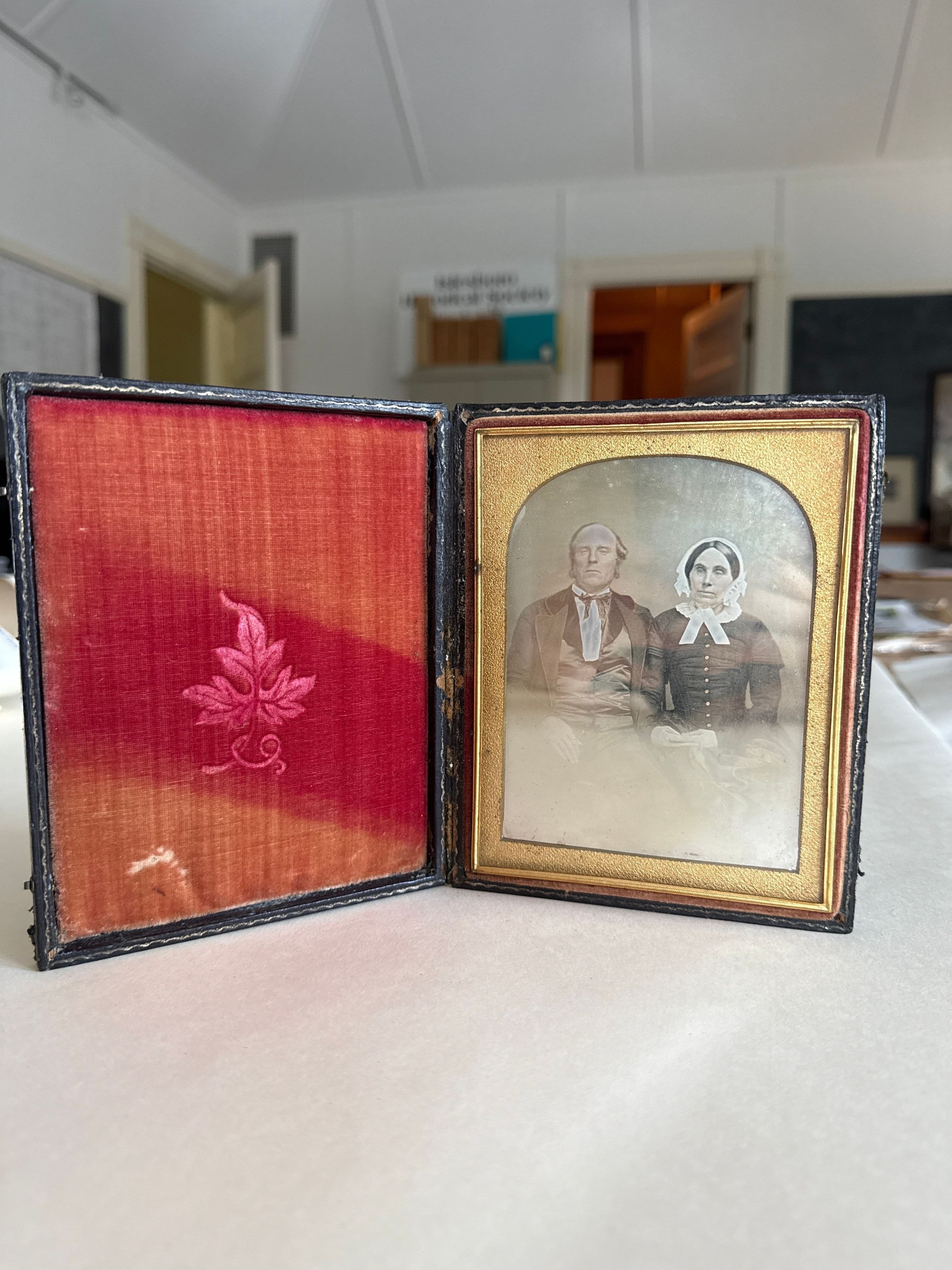 Large daguerrotype 5x6 in intact tooled leather case, gilded interior frame. Man elegantly dressed in coat with velvet collar, satin vest with velvet collar, string tie, chin held high. Identified as Capt Elisha Trim (1806-1871). Farrow says he was master mariner. Woman by his side is identified as Mrs Phebe Trim (1802-1876), nee Williams, daughter of Amos Wms. She wears a black silk dress, tight bodice buttoned down front, full skirt, white lace collar, white ruffled bonnet. Interesting resemblance to unidentified daguerrotype cat. 1994.027.0007.