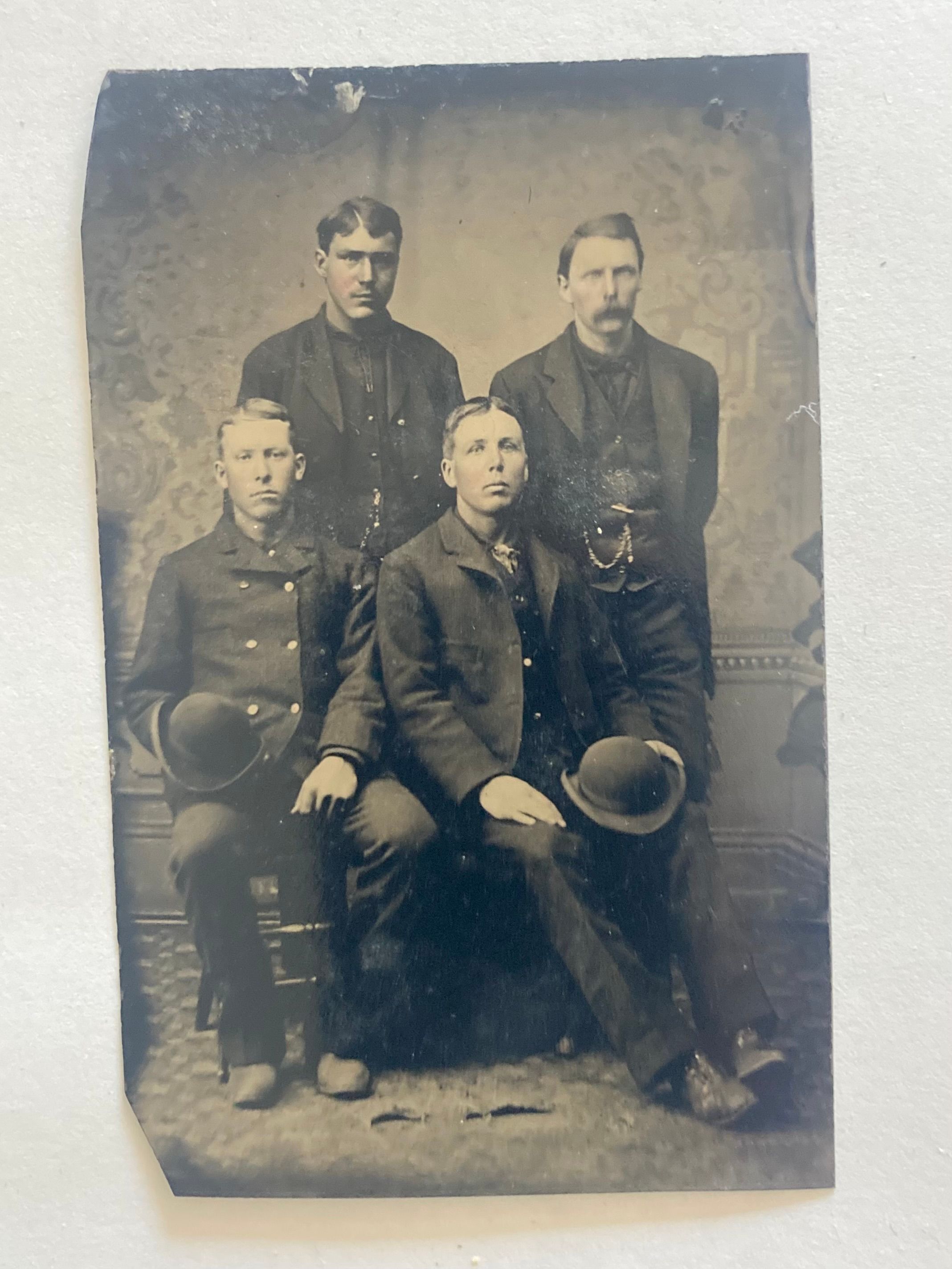 Tintype portrait of four men (2.25" x 3.5"), probably two generations, unidentified.