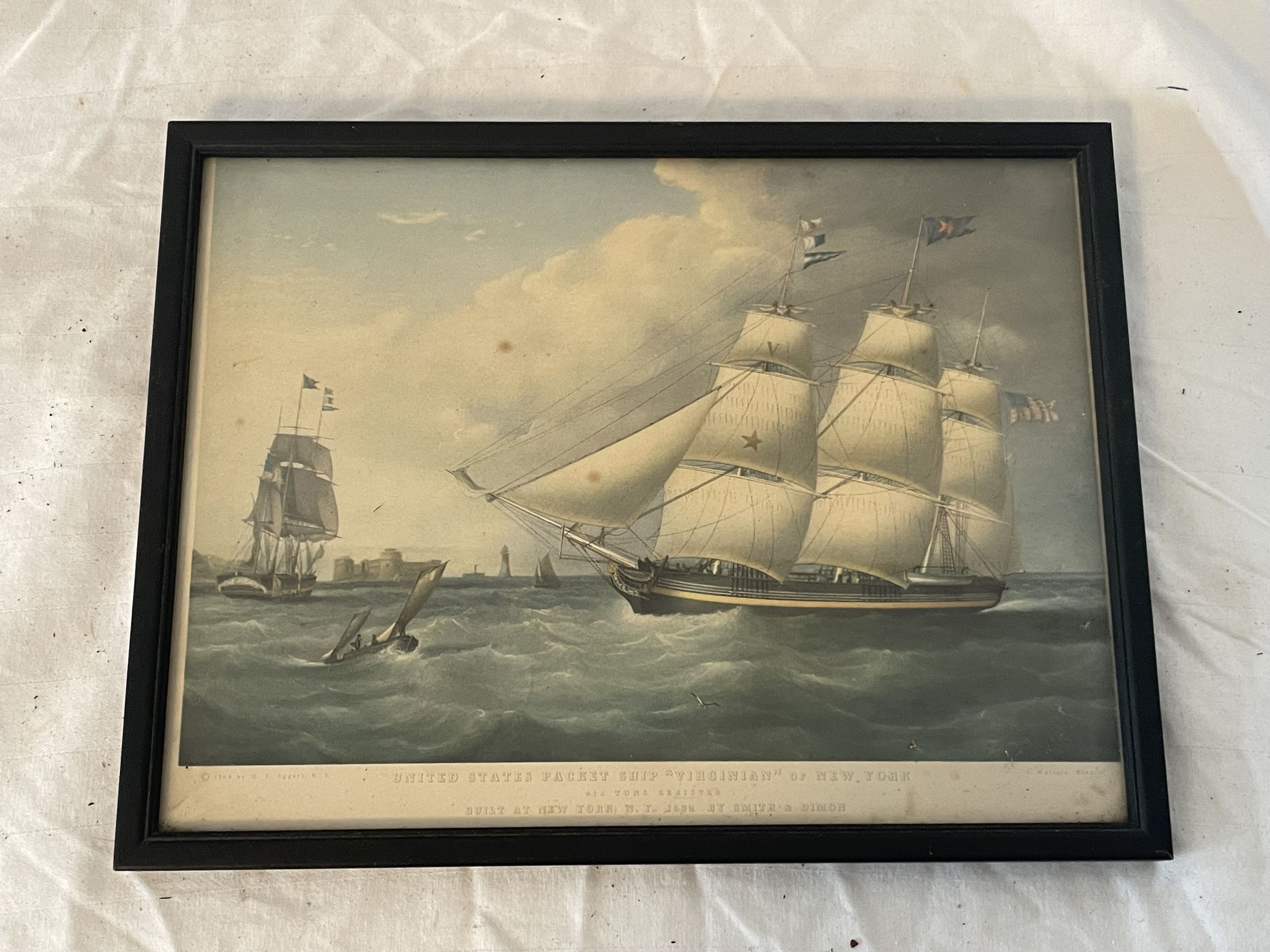 a framed print picture of the ship "Virginian of NY" sailing through some rough seas, with all sails up and catching wind.