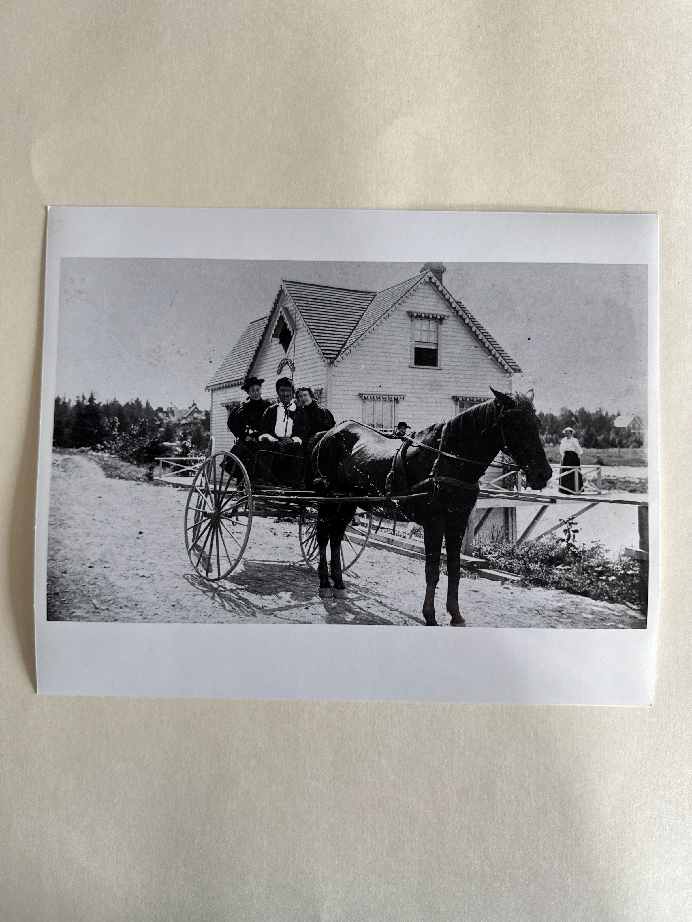 2 photos at Cliff Cottage, Hewes Point, of Bill Dick Pendleton with his horse & carriage driving two women