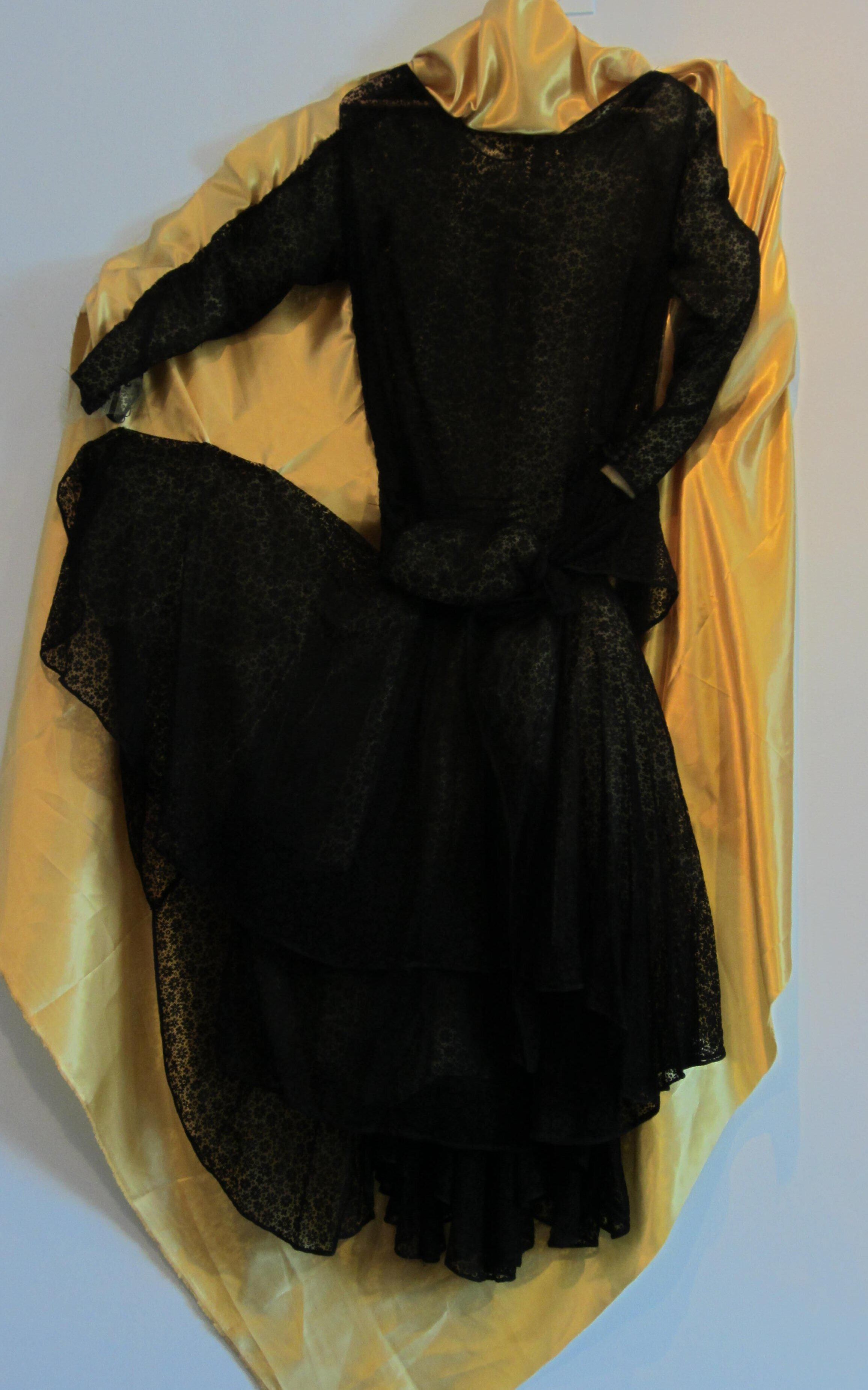 Black lace dress. Small floral design. Elaborate skirt has many extra pieces of fabric added at waist. Sleeves 23 3/4 inches long with 5 cloth-covered buttons at cuff.