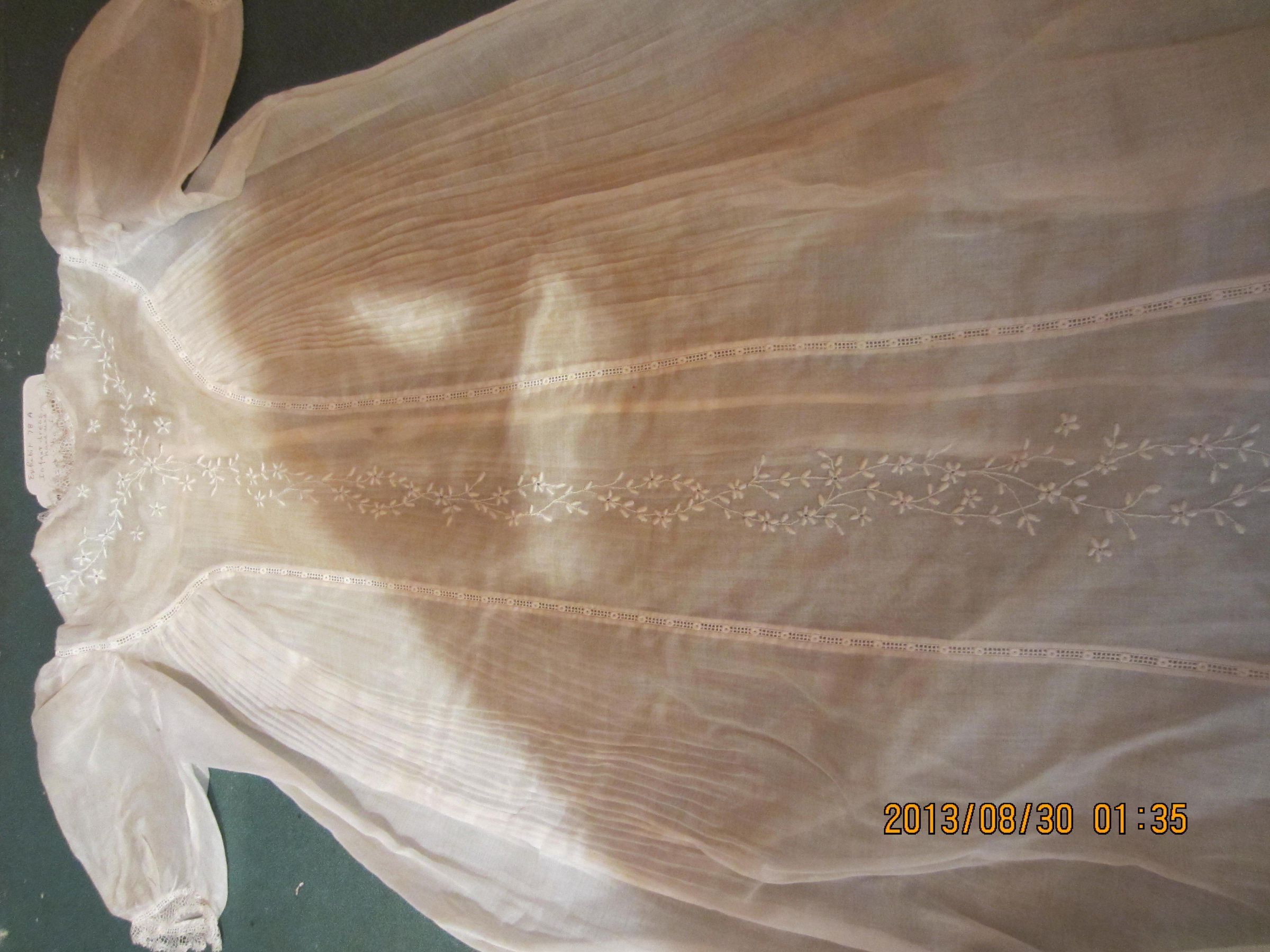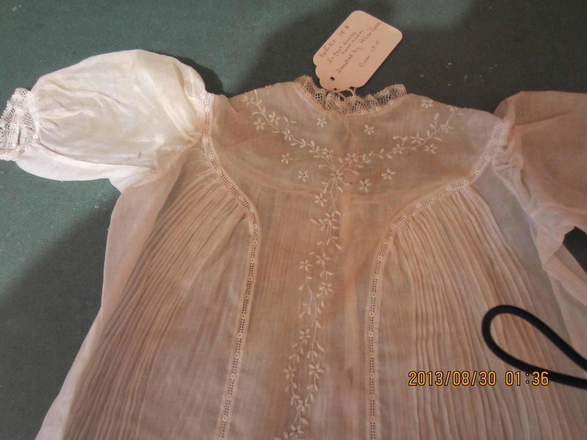 Infant's dress. Front, from collar to hem 26 1/2 inches, width at hem, 27 inches. White dress with sleeves 6 1/2 inches long, has embroidered yoke from back to front and center panel of embroidery down front. Center panel and yoke are set off from body of dress with 1/8 inch wide embroidered insertion. Fine tucks are on either side of center panel and across back below yoke. Sleeves and neck trimmed with lace. Dress is secured with four tiny buttons at back.