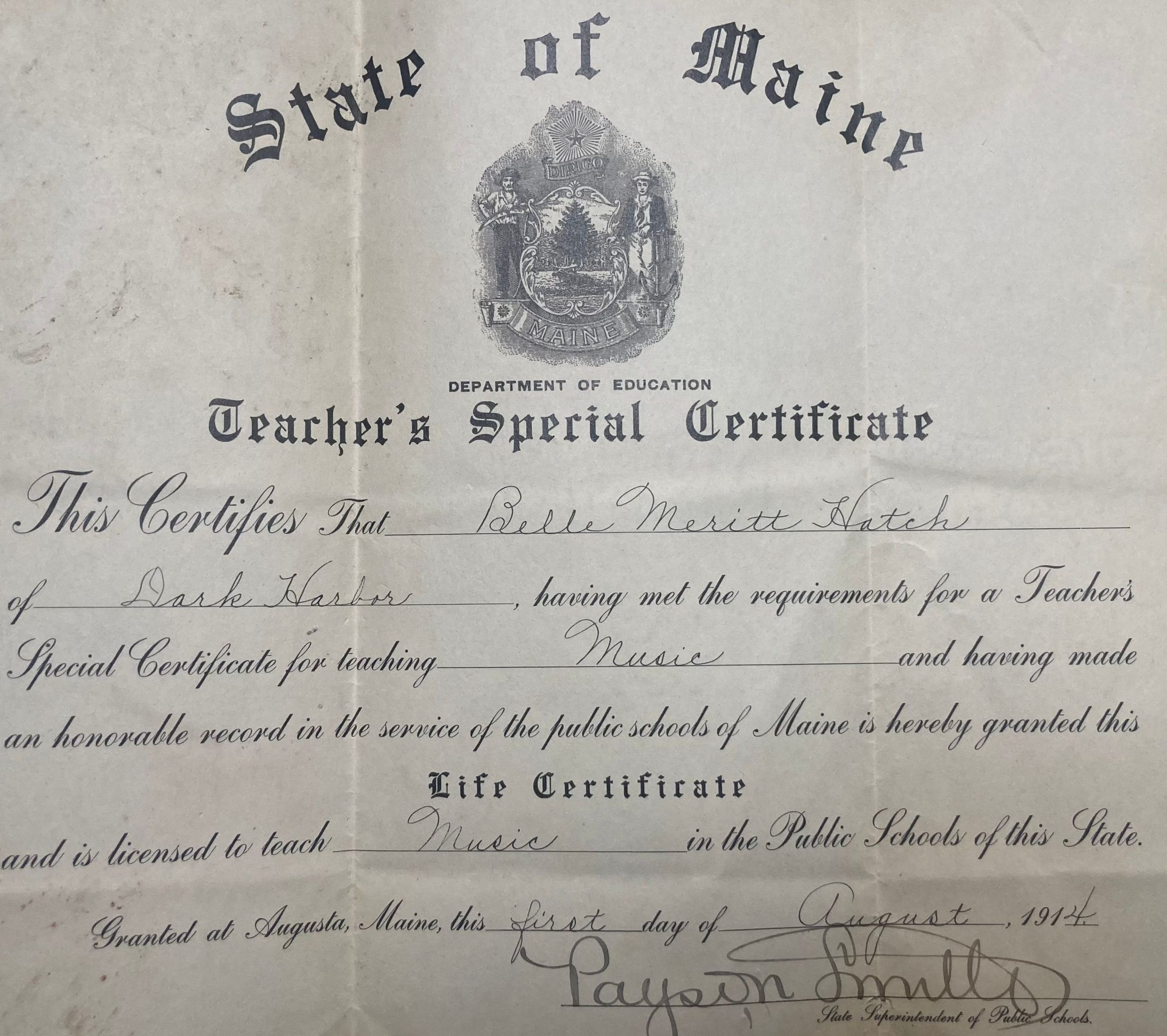 State of Maine Special Teacher's Certificate in Music, awarded to Belle Meritt Hatch of Dark Harbor, August 1, 1914.