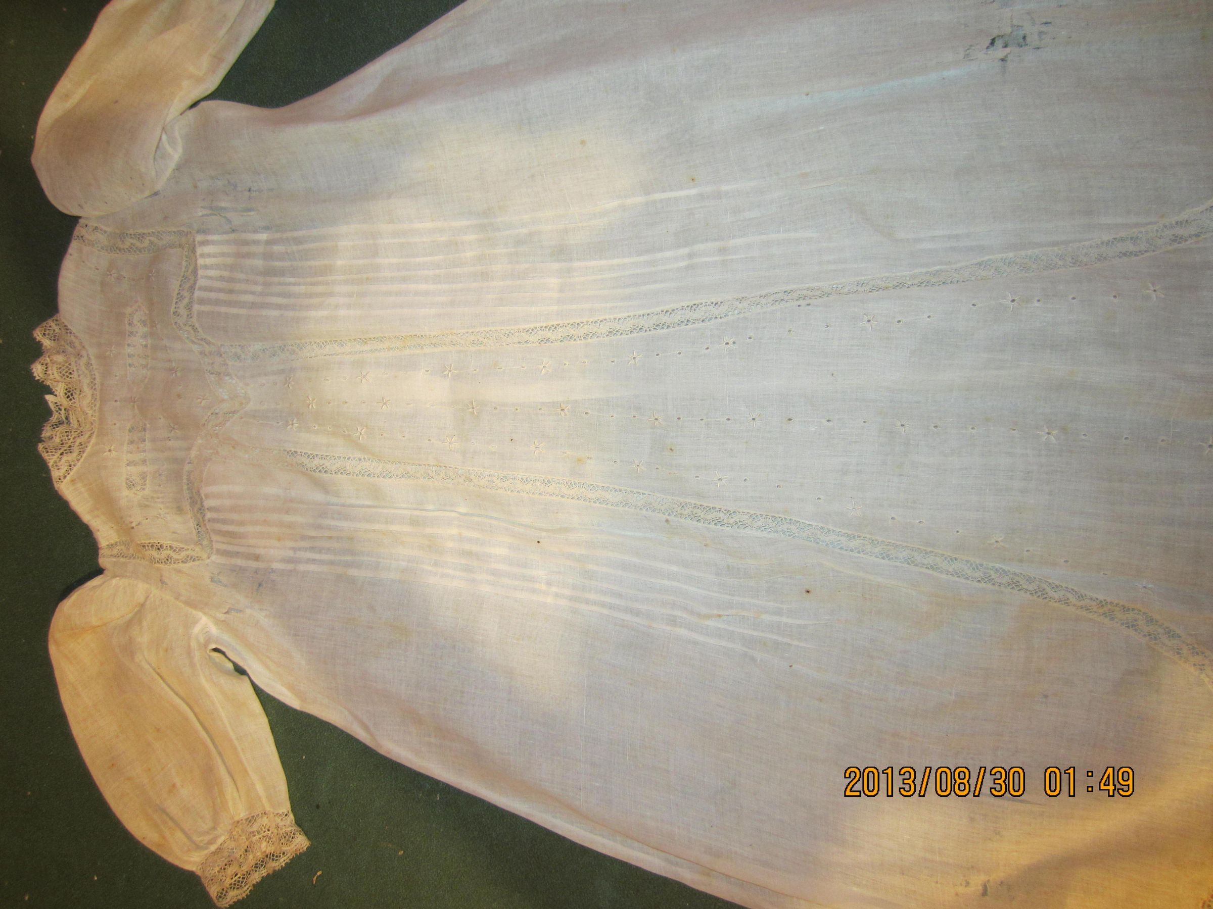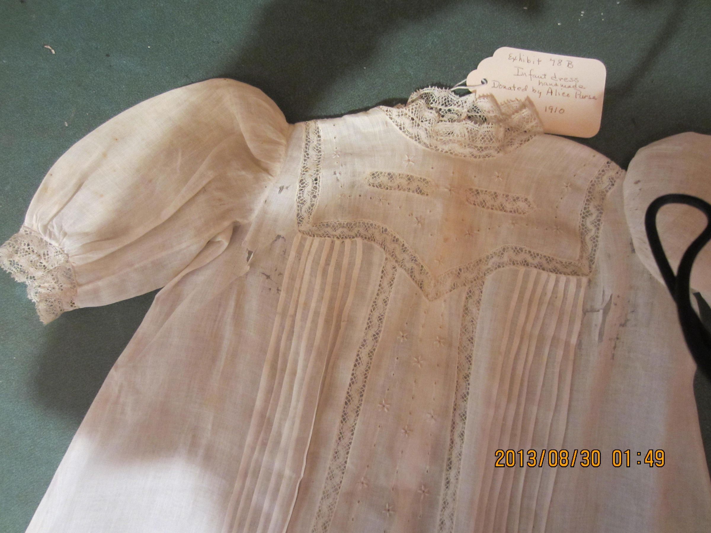 Infant's dress. Front, from collar to hem 27 5/8 inches x width at hem 28 1/2 inches. White dress with sleeves (7 3/8 inches long). Dress has 7 fine tucks on either side of delicate, embroidered openwork center panel. Lace, probably handmade, around neck, cuffs, and numerous inserts. Back of dress includes 5 tucks on either side of closure, which has 3 buttons. Dress is handsewn.