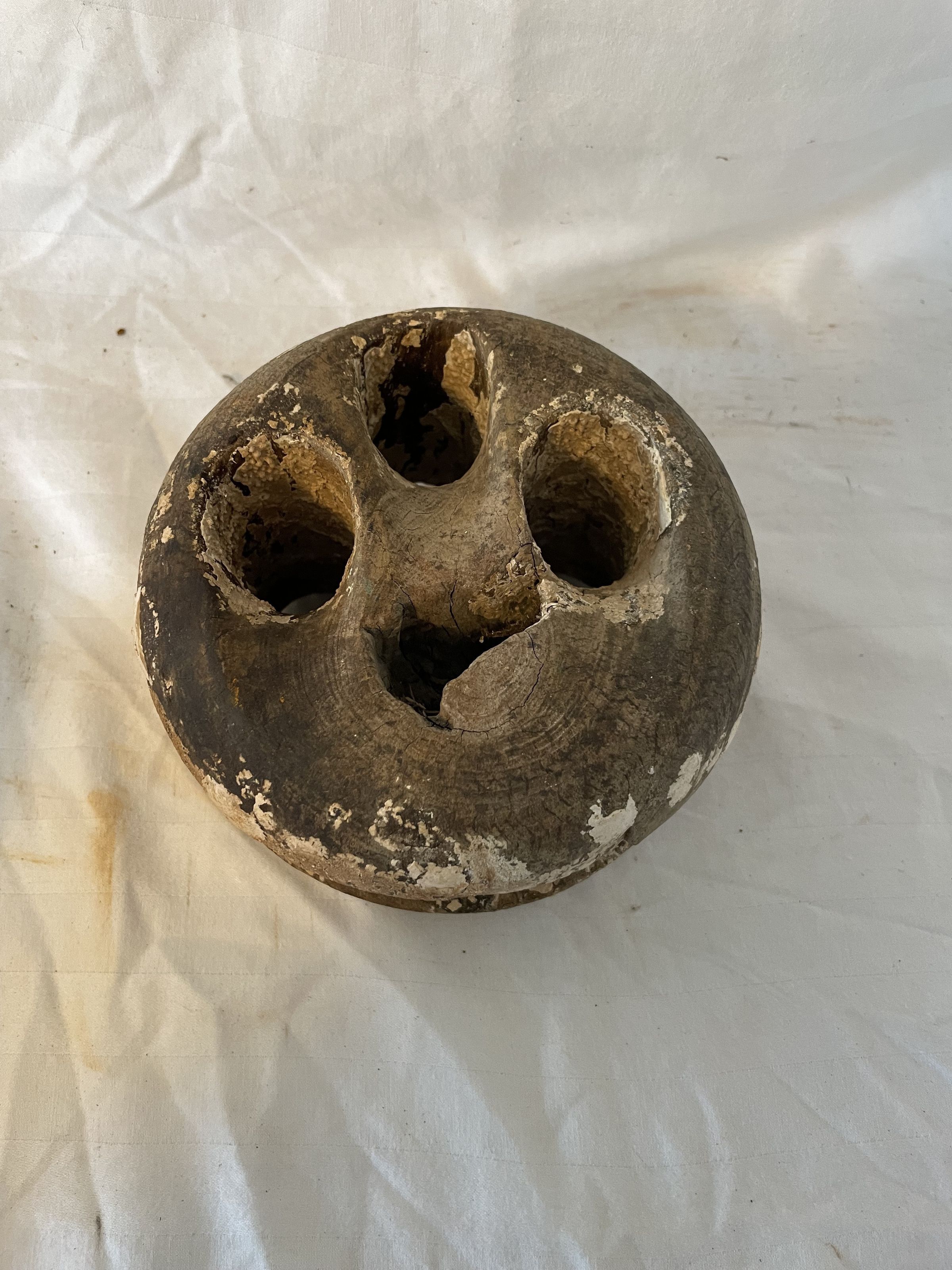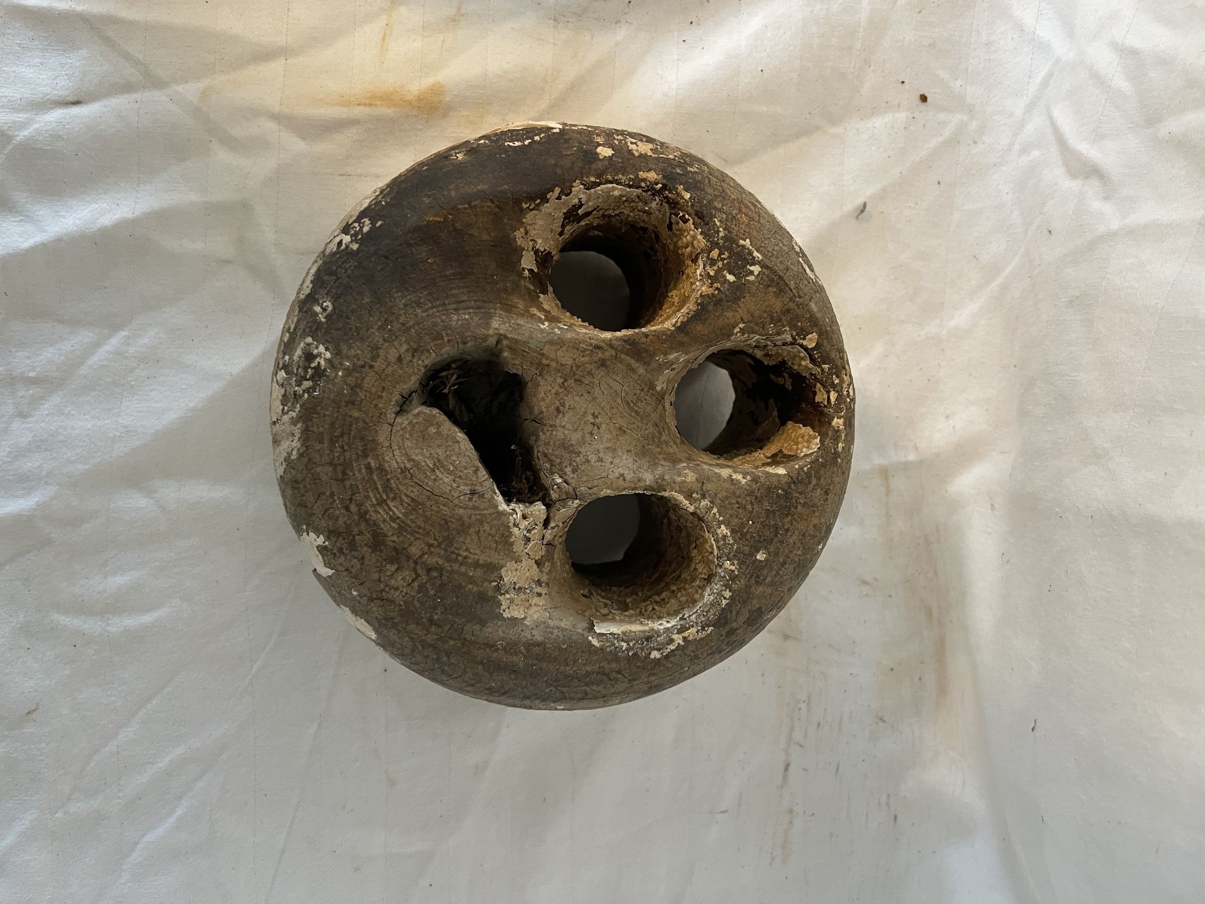 A three hole wooden circle, identified as a dead eye. Chipping white paint, exposed wood