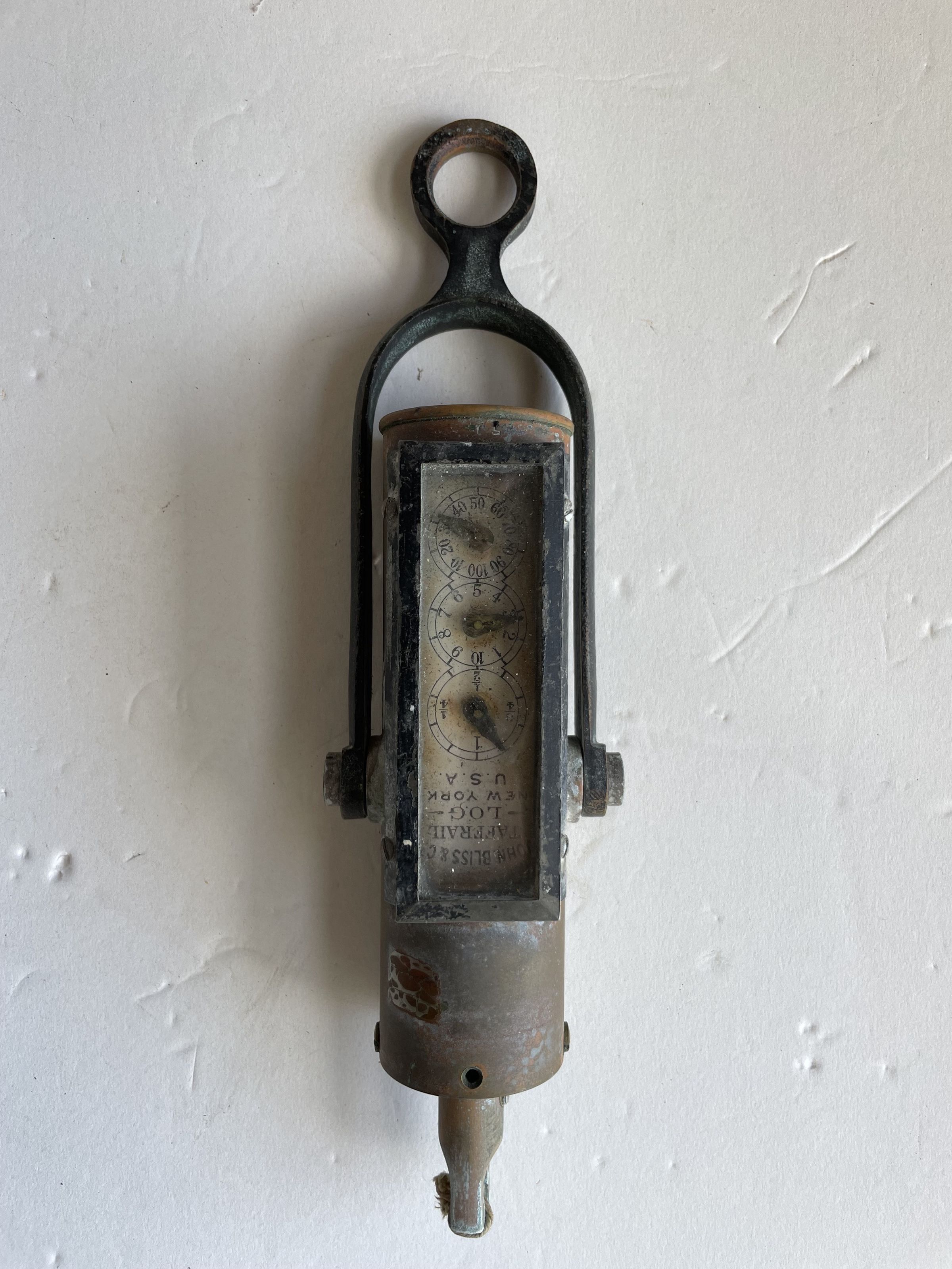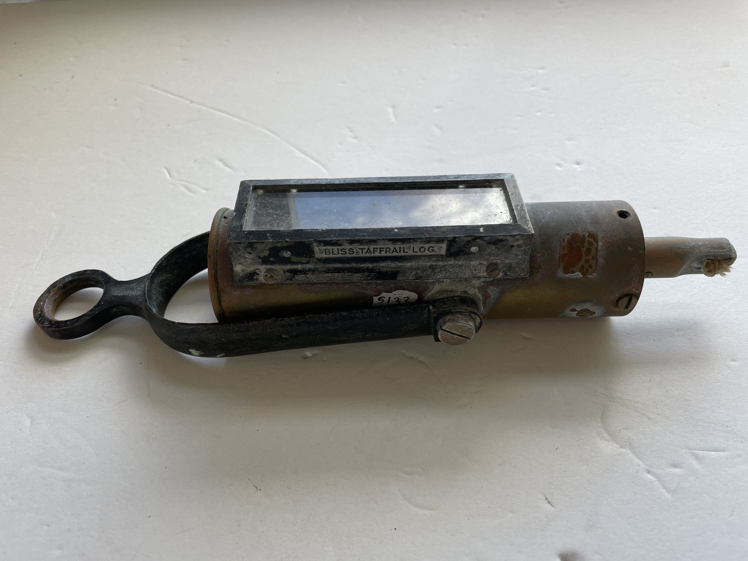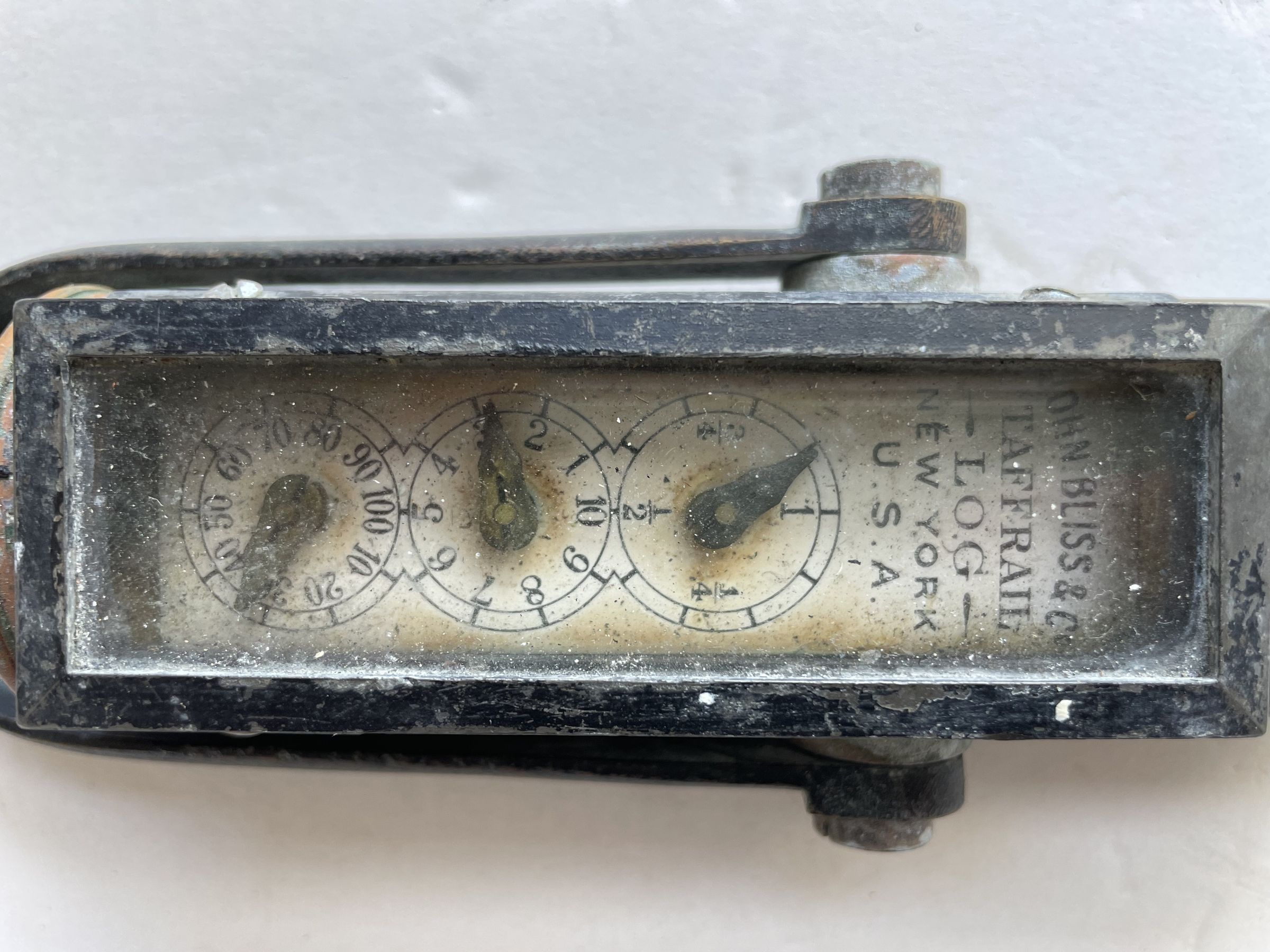 Brass Taff rail log used for measuring distance in land miles, not nautical miles, on a moving vessel. The log does not have any attachments.