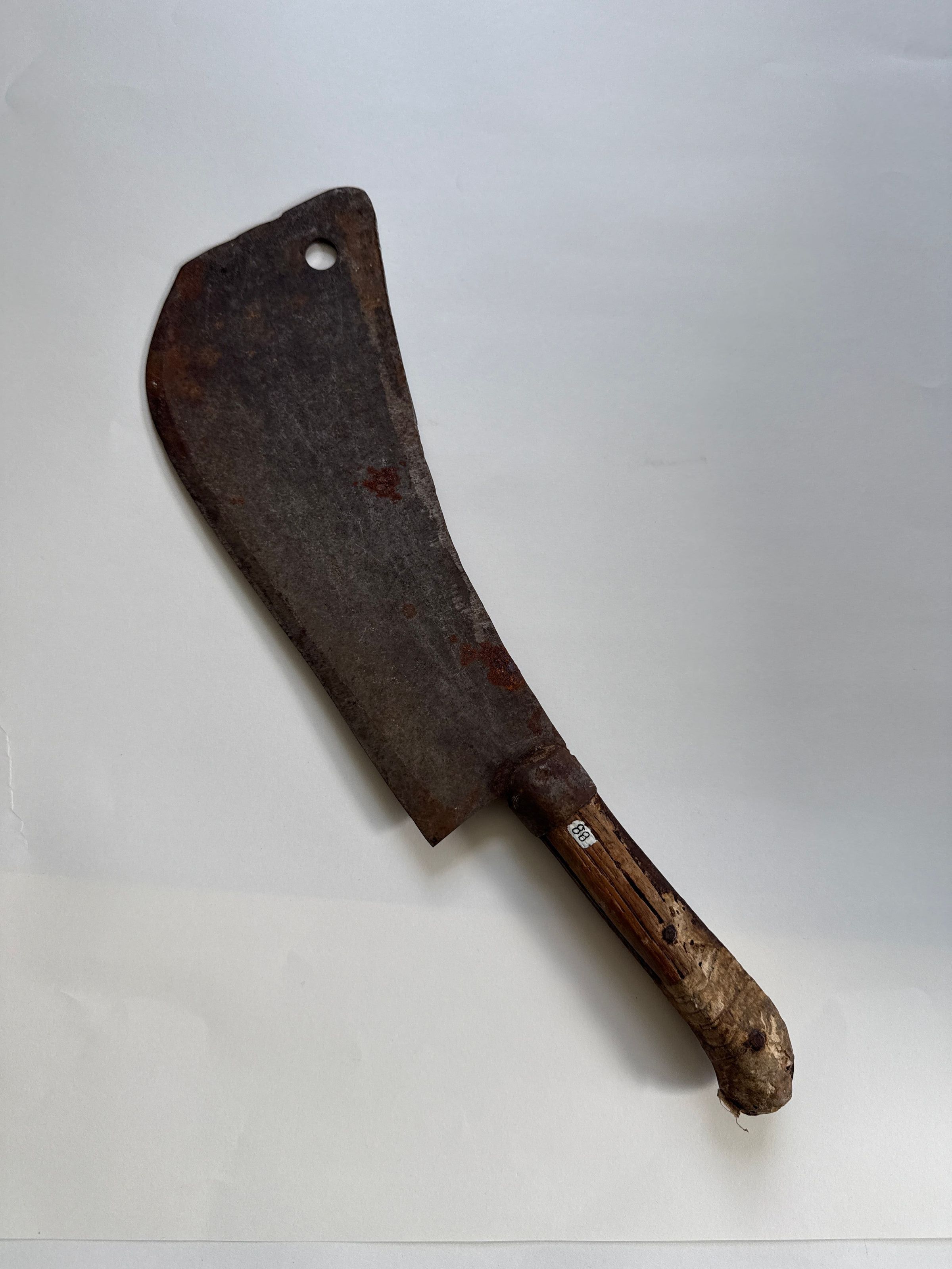 15 3/8 inches x 4 1/4 inches x 1 1/4 inches. Handle is 5 inches long repaired with cloth tape. Blade is attached to handle by metal cup, rather than inserted. Blade has hole at end for hanging.