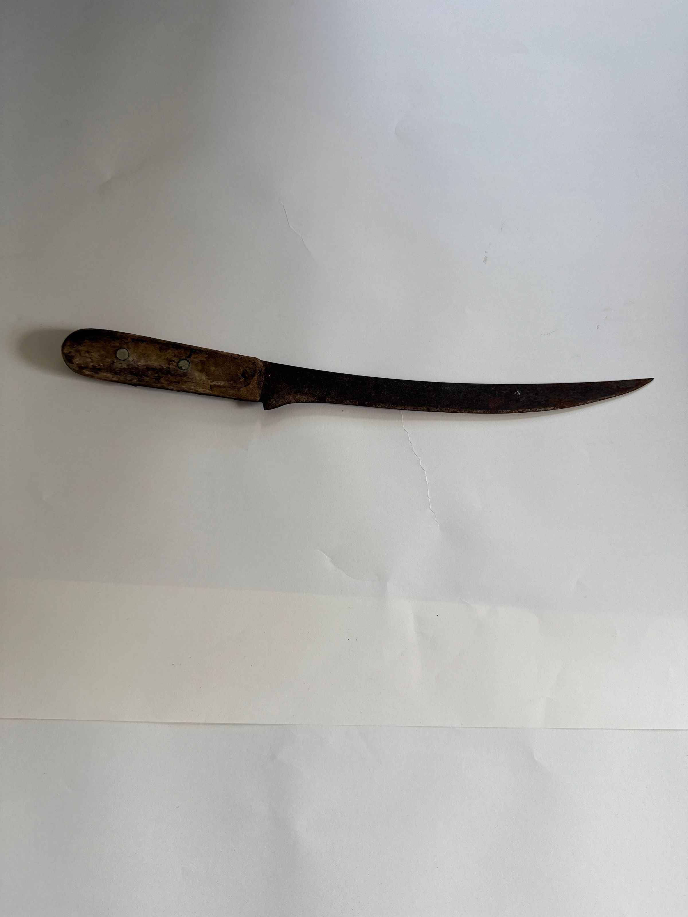 16 3/4 inches x 1 3/8 inches x 1 inch. Knife blade tapers at blade end and curves up, 11 1/4 inches. Wooden handle 5 1/2 inches long. 3 metal rivets.