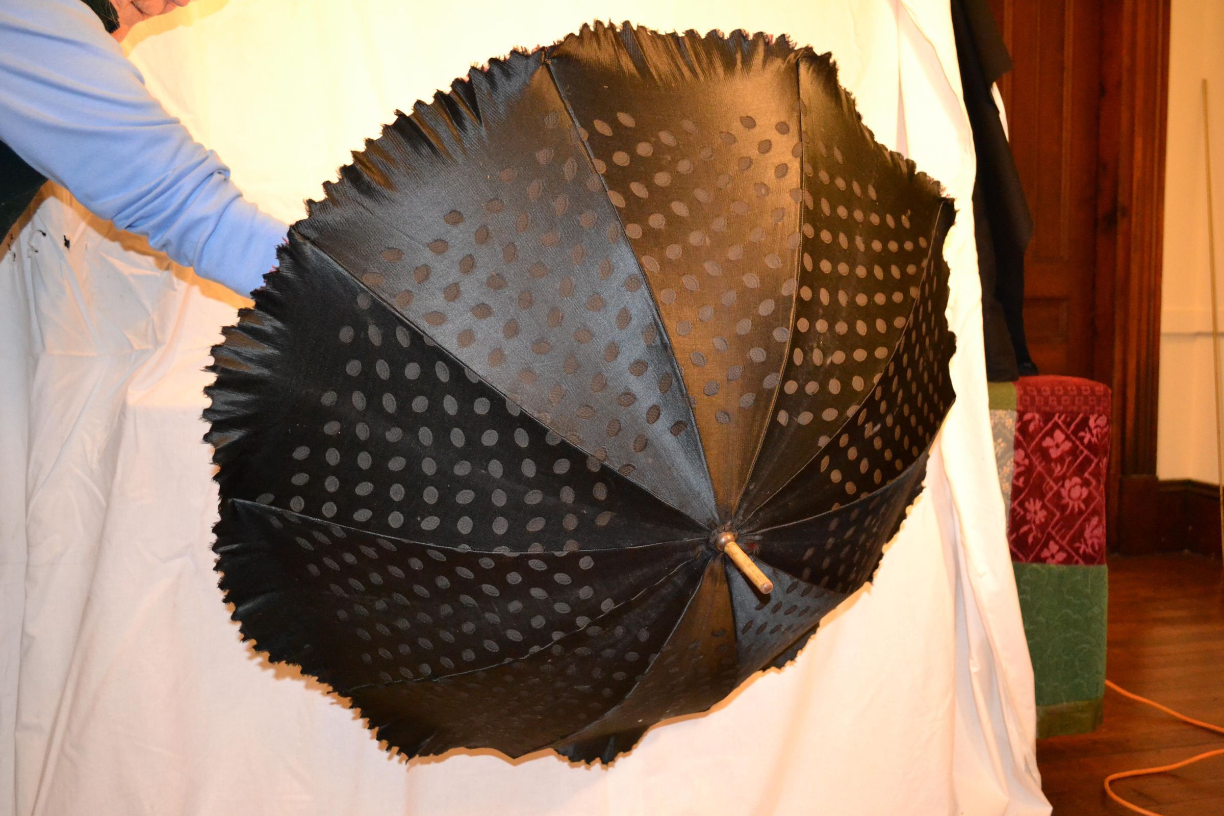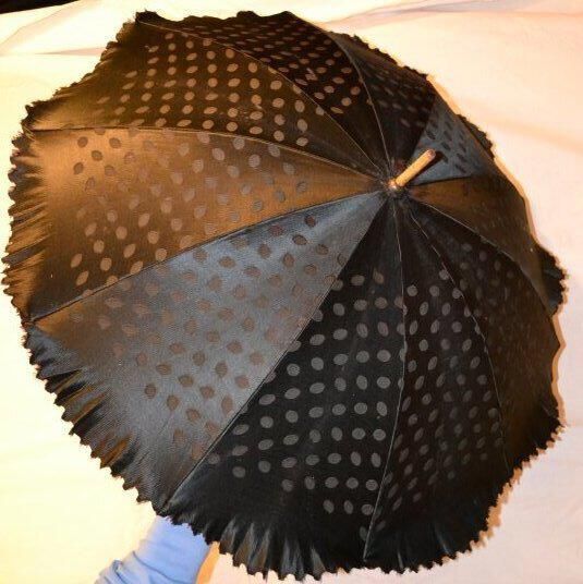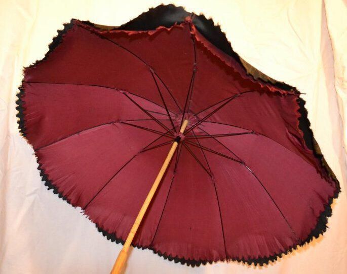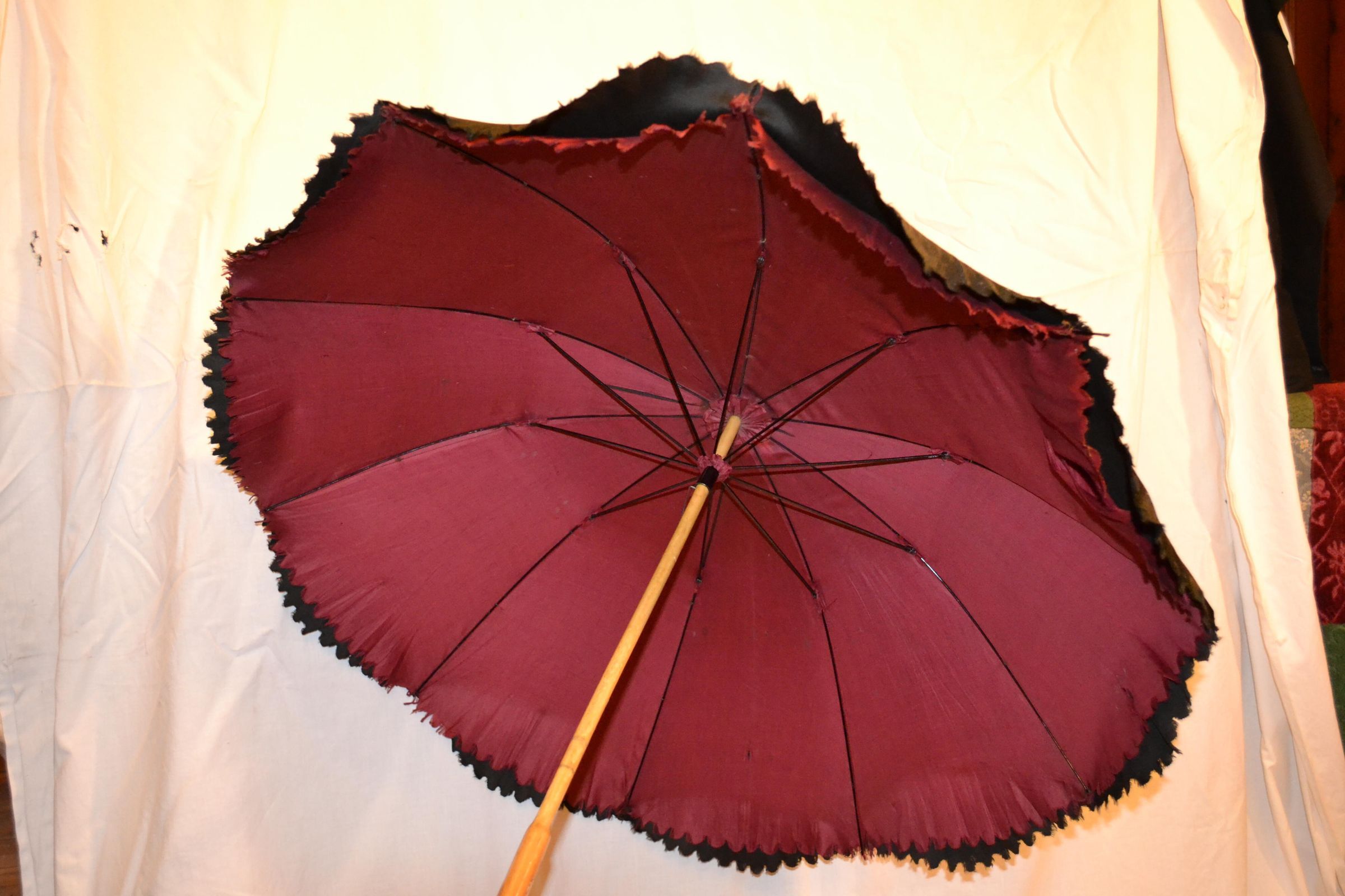 32 inches long. Handle is wood, twisted and knobby with forked end. Frame work is metal. Black fabric (17 1/2 inches long) is embroidered with black dotted ovals. Lining is purple red.