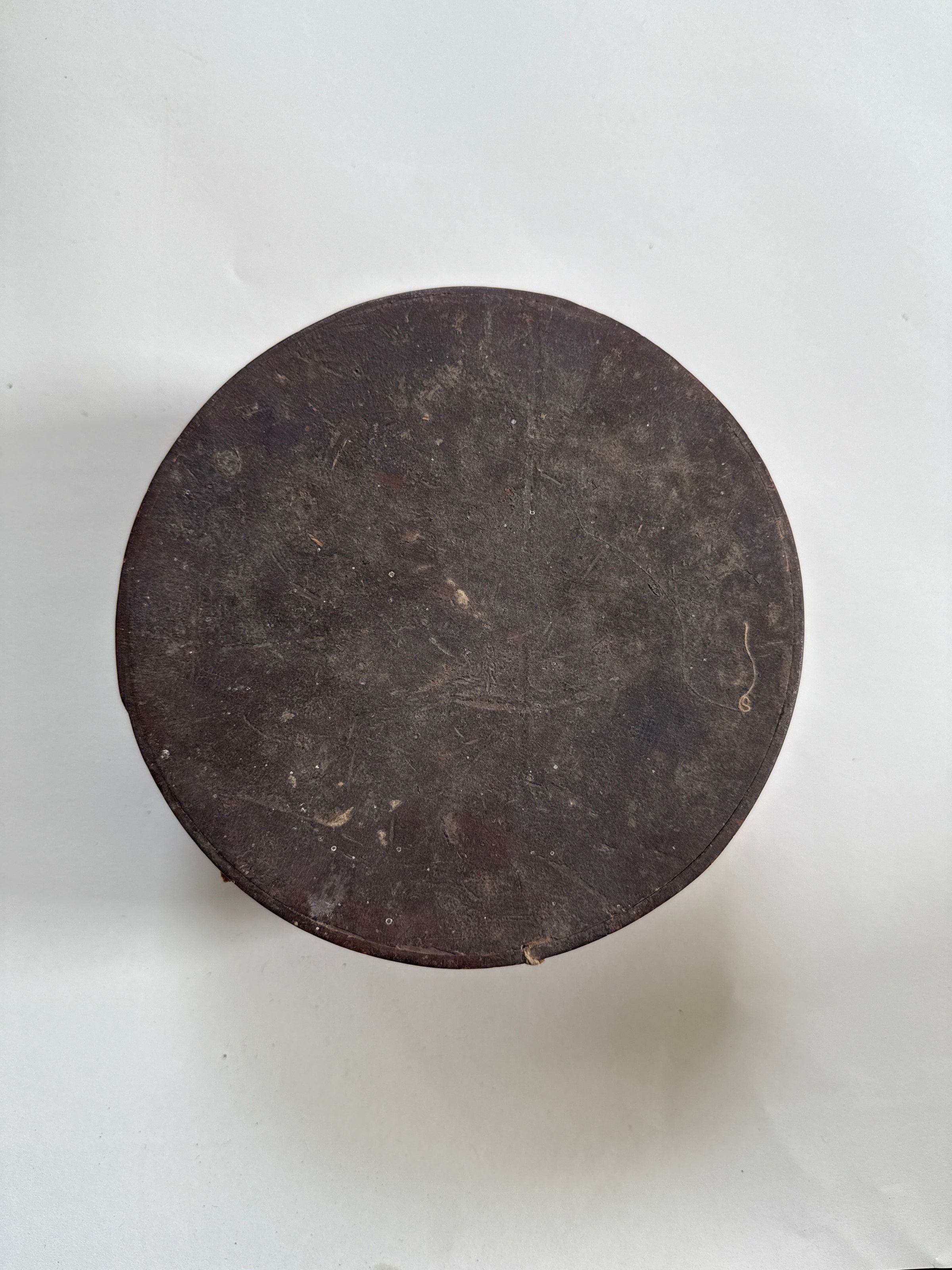 Round with top 6 7/8 inches x 2 7/8 inches;. Round wooden box, side is made of a single piece of wood with an overlapped joint held with 3 small nails. Top is made in same manner, joint on top has been repaired by tying strings through drilled holes. Outside of box is painted reddish brown.