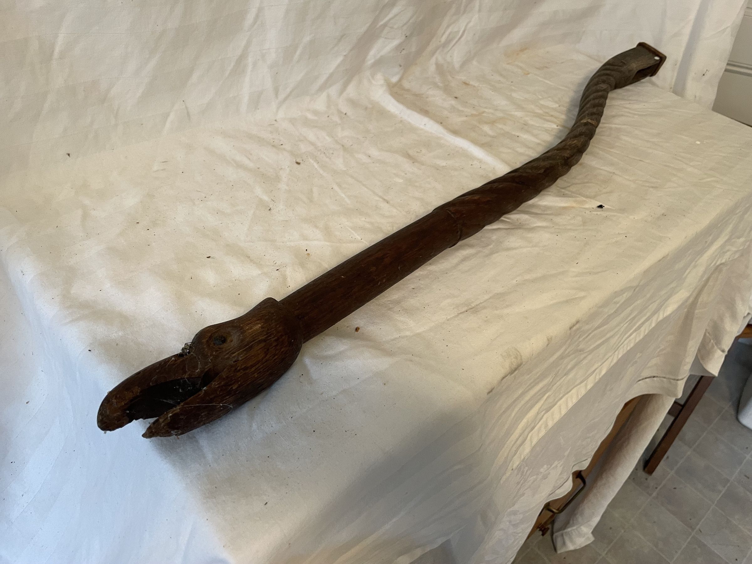 Wooden Carved Tiller, owned by Captain Charles Hatch . Carved snake head on one end.