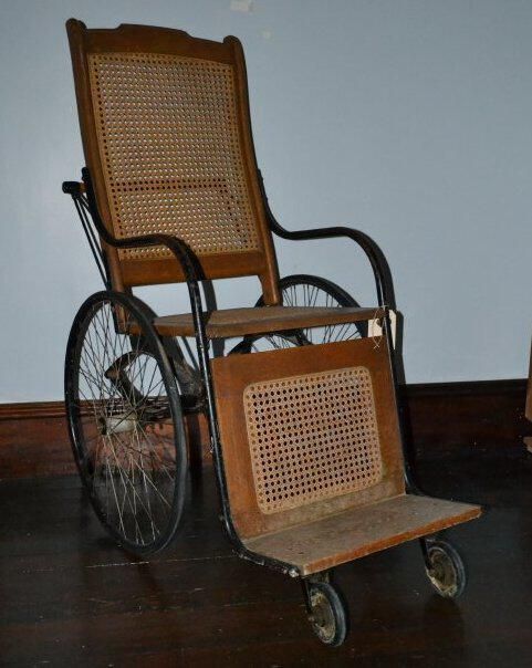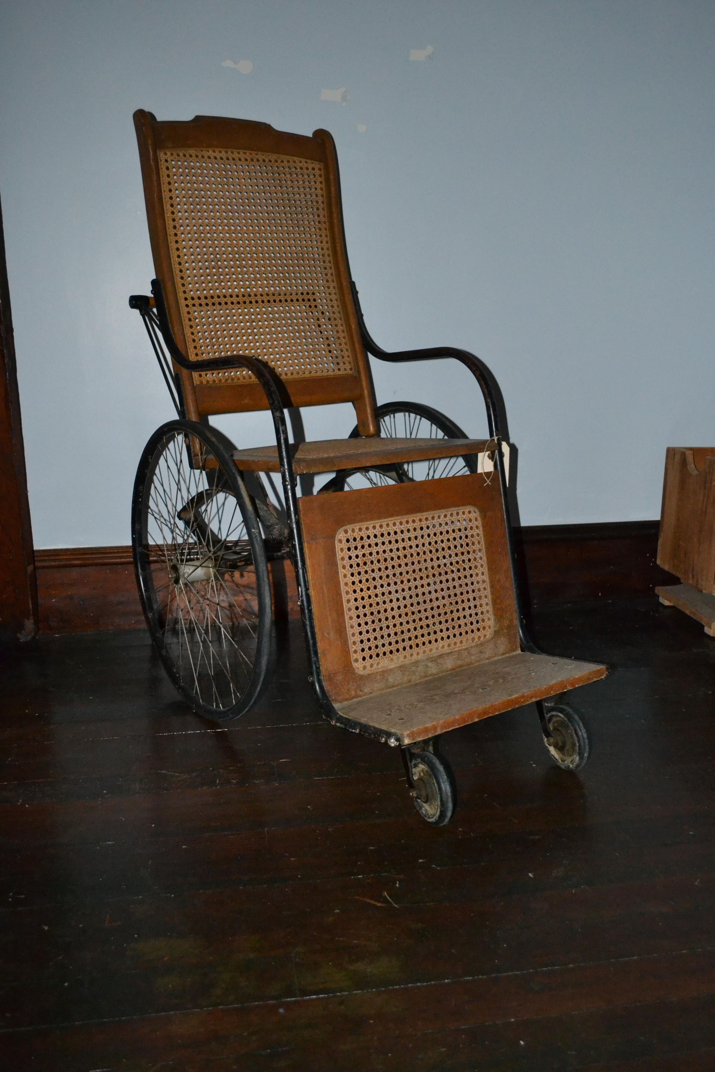 51 3/4 inches x 23 5/8 inches x 42 inches. Black painted steel frame has wooden seat and back with caning. Has wooden footrest and wooden handle for pushing. Wheels have metal spokes and rubber tires (26 inches in diameter).