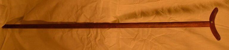 51 1/2 inches long x 1 1/8 inches diameter. Arm support: 7 3/8 inches long. Smooth rounded length of wood is through tenoned into arm support.