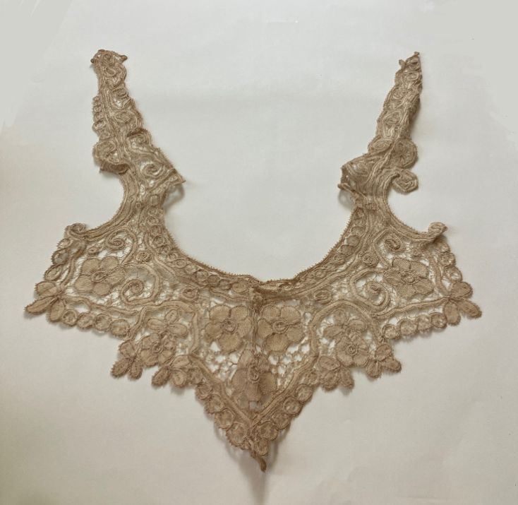 22 3/4 inches x 16 3/8 inches. Off white lace collar, includes 5 lobed flowers