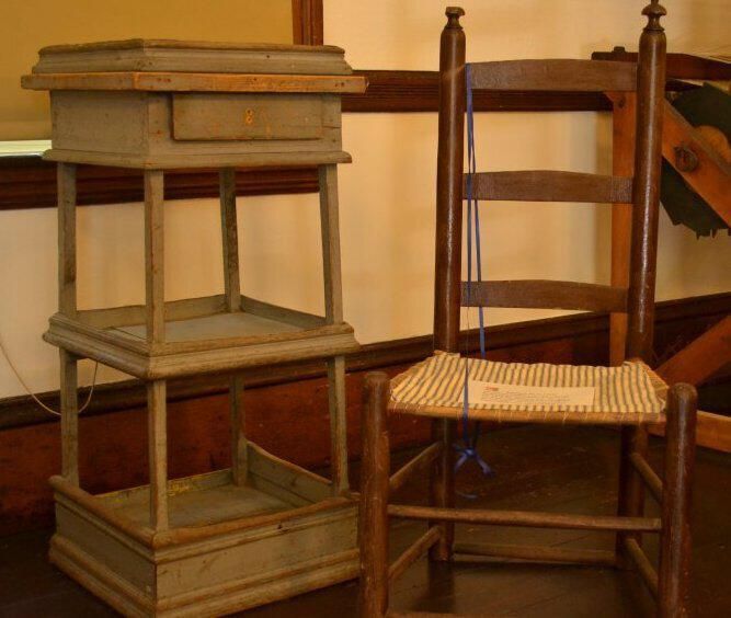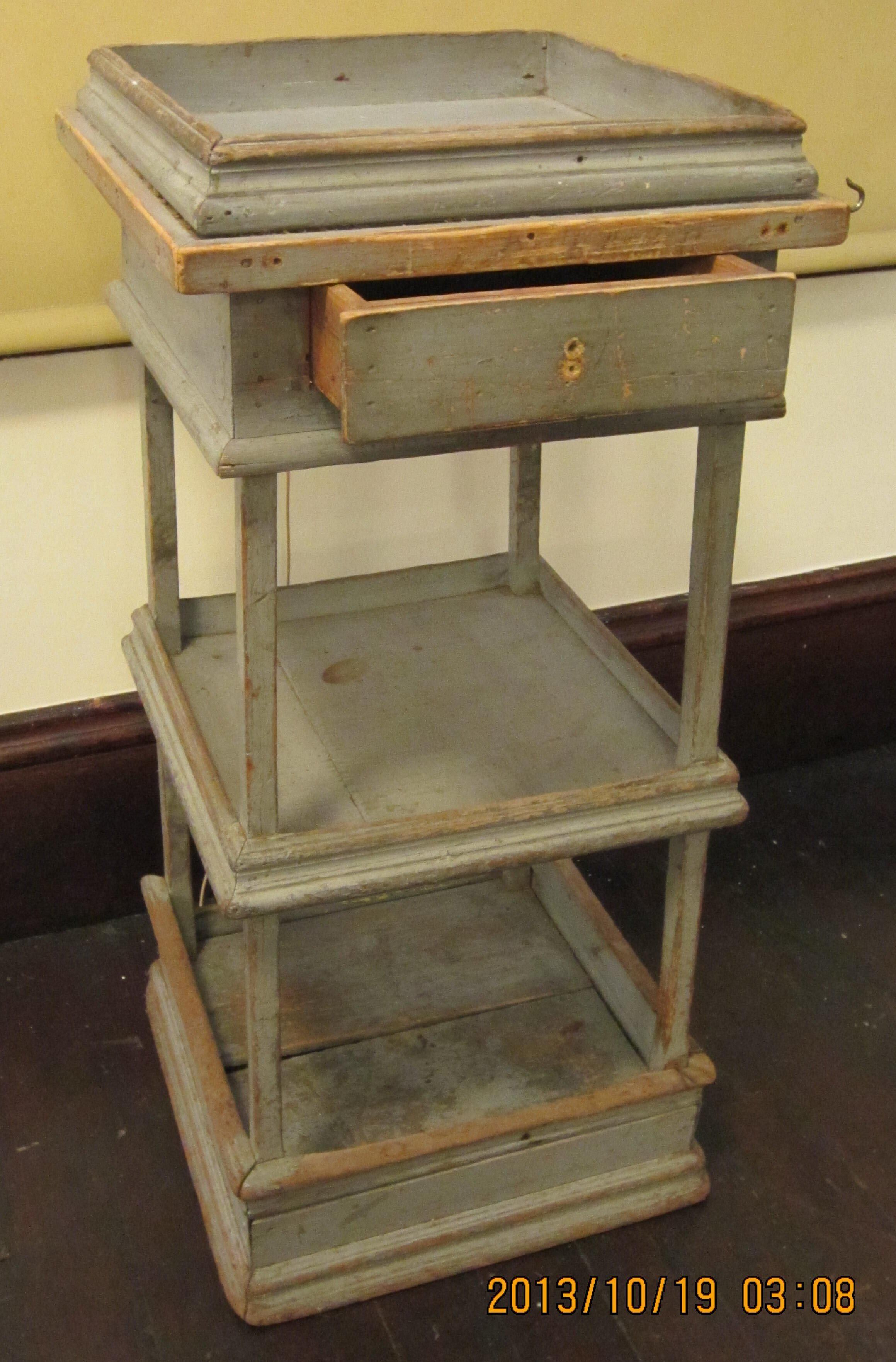 The netting stand measures 33 1/2 inches x 15 1/2 inches x 15 1/2 inches. Table has two shelves and a flat area at top. Each part is enclosed by molding. A small drawer is at top. 3 metal hooks protrude from top, just below molding. Other holes, probably made for other hooks, are evident. Gray paint is worn in many places. Special Significance: A family netting stand about 120 years old (c. 1865). Constructed by Yeaton Dodge for his daughter Faustina Randlett.