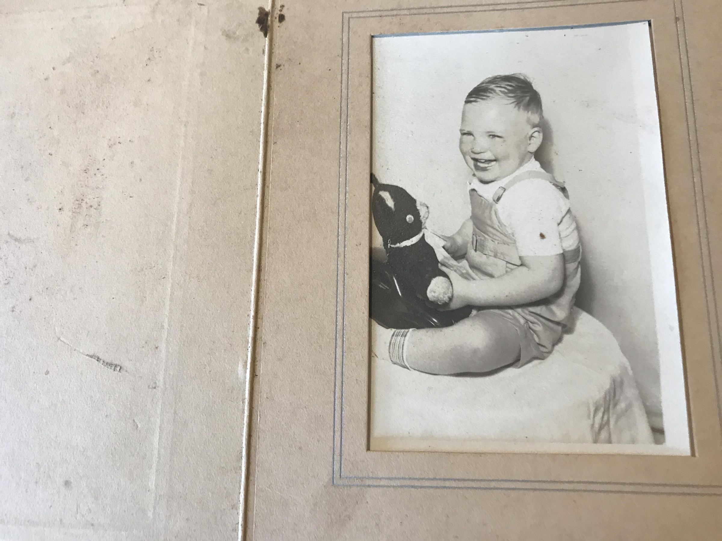 Studio portrait of a young boy with stuffed bear. B/W 3x5 picture in a cardboard folder