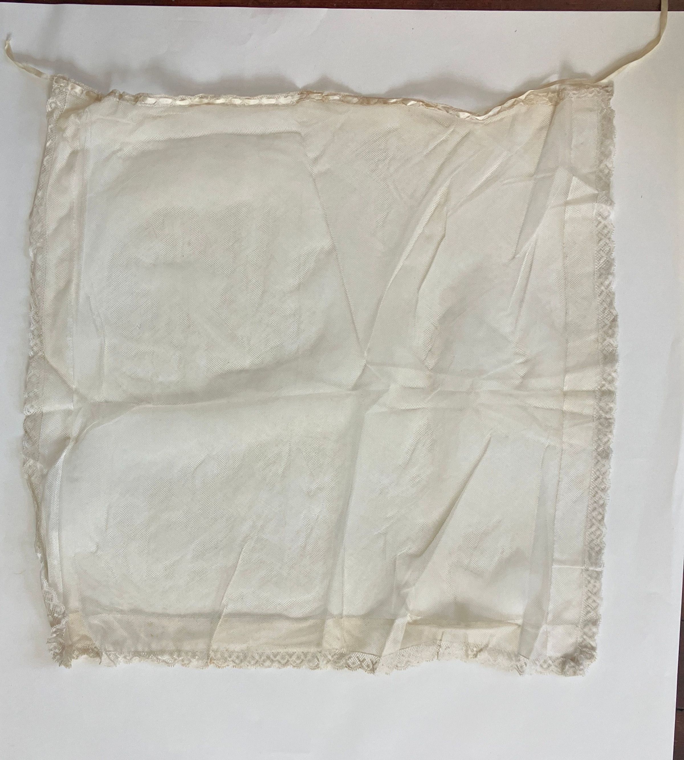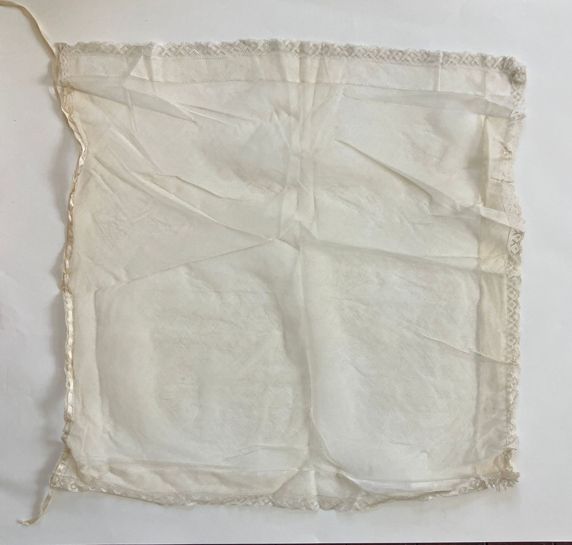 At bottom hem 22 1/2 inches a 20 1/2 inches. Simple lace net apron trimmed with bobbin lace that has scalloped edge. A narrow ribbon 3/16 inches wide x 26 1/2 inches long is run through lace at top to make a gather. Ribbon has come out on one end.