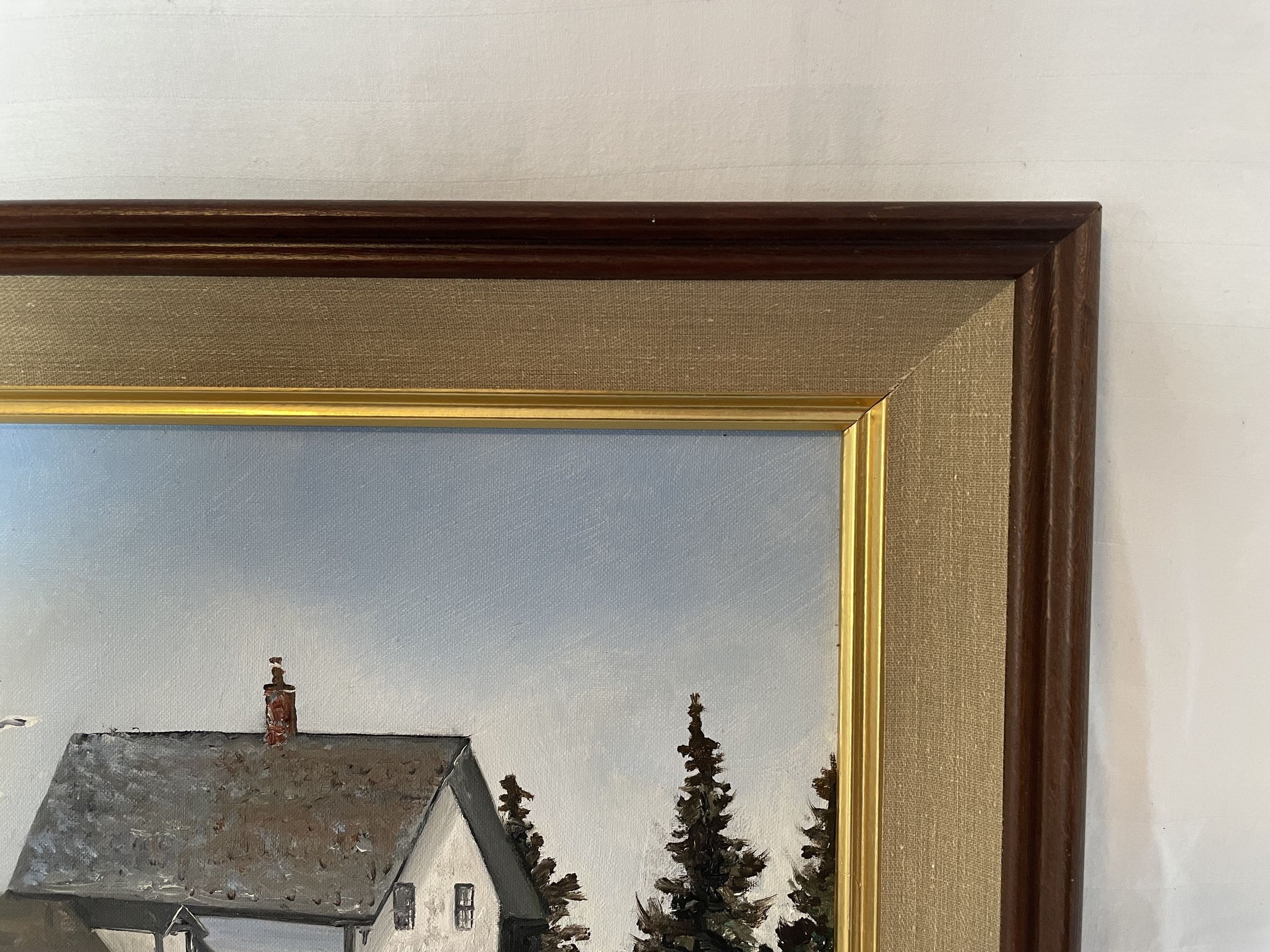 The painting is signed "Hedrick", identified in the marcy ledger as Carol Prentiss Hedrick. The year is unknown. It is framed in a wood, canvas, and gold rimmed frame.