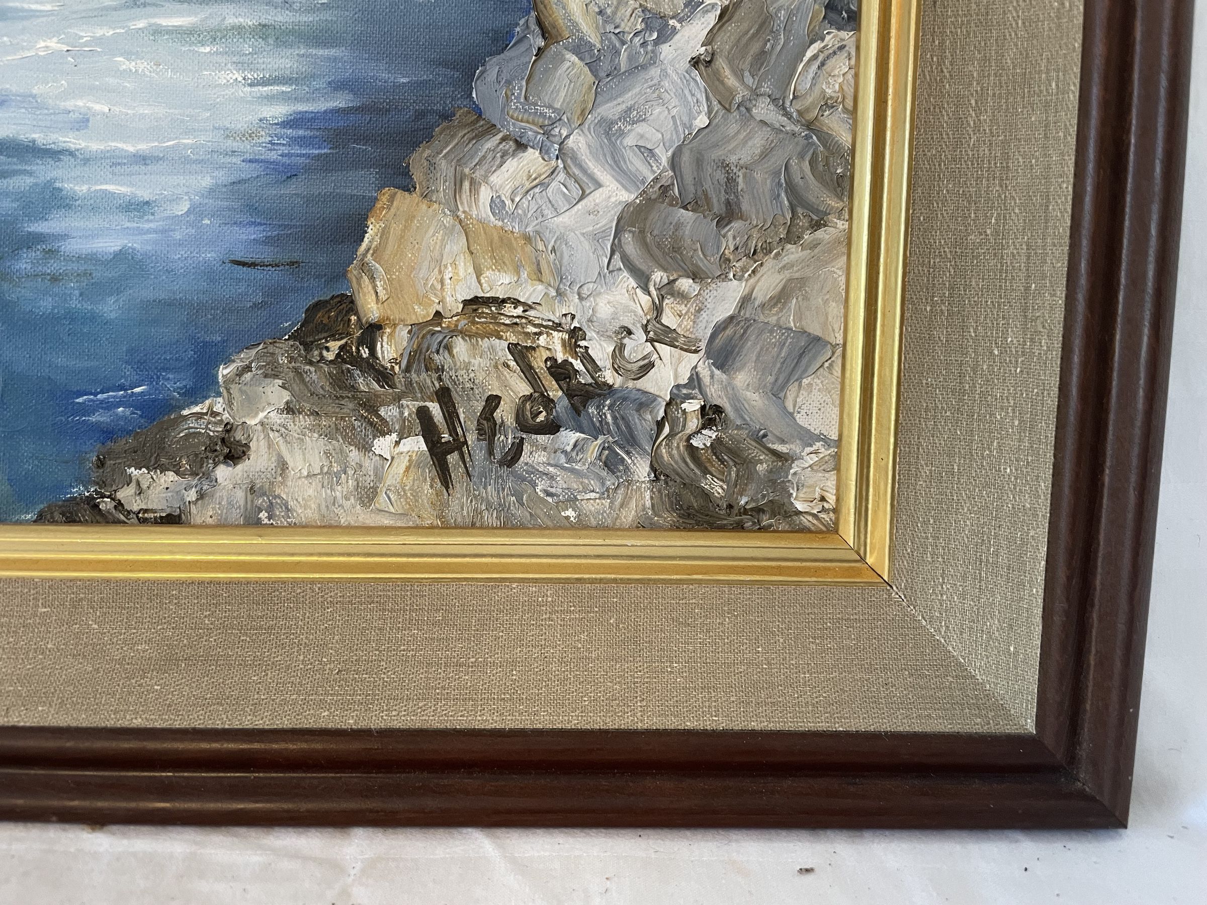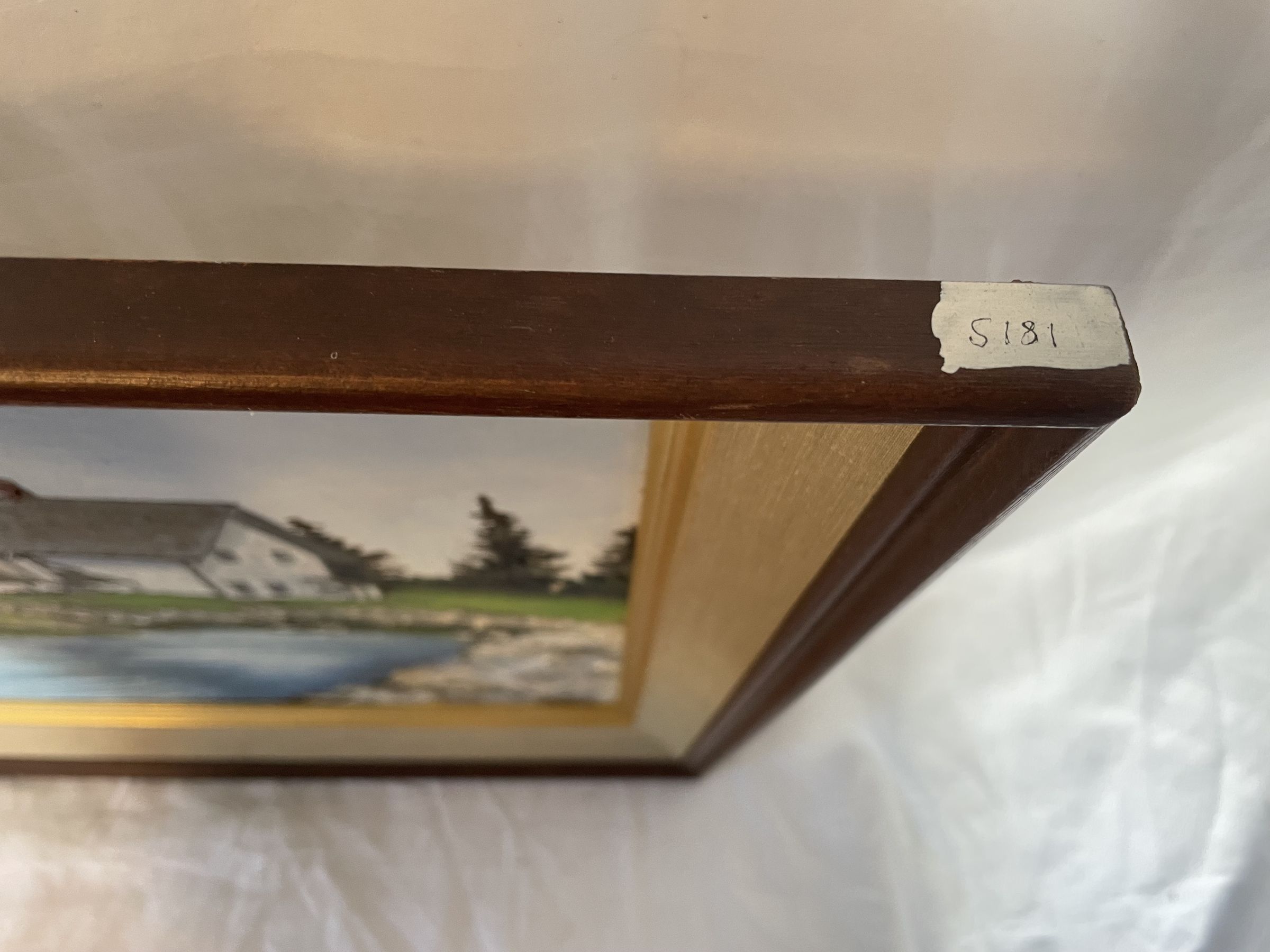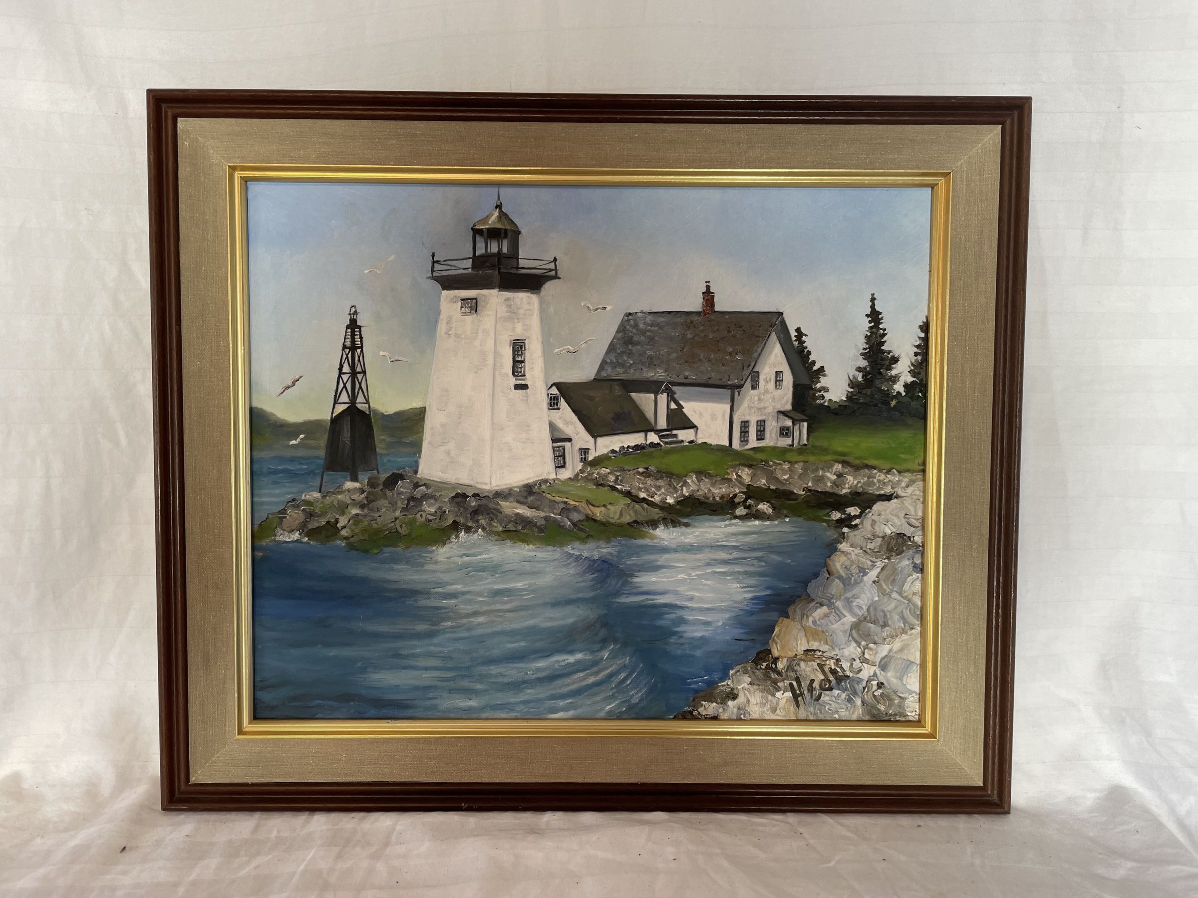 A framed oil painting of the Grindle Point Lighthouse, tower and keepers house, on Islesboro, Maine. The image features pine trees, seagulls, and a swept sea.