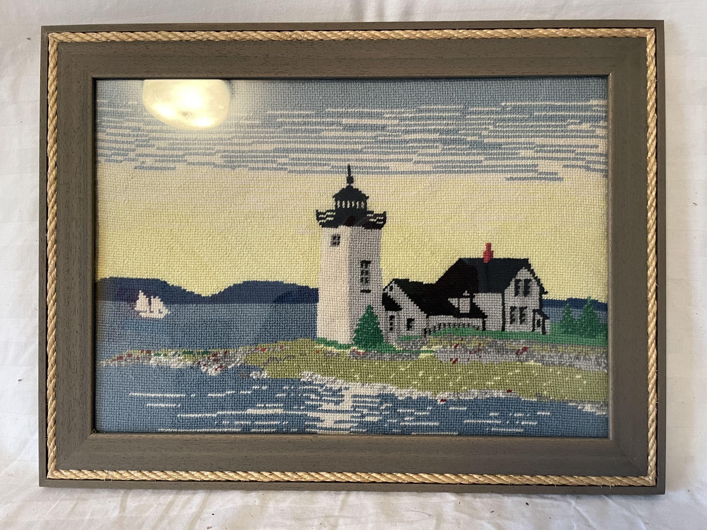Needlepoint of Grindle Point Lighthouse by Anne Kilham